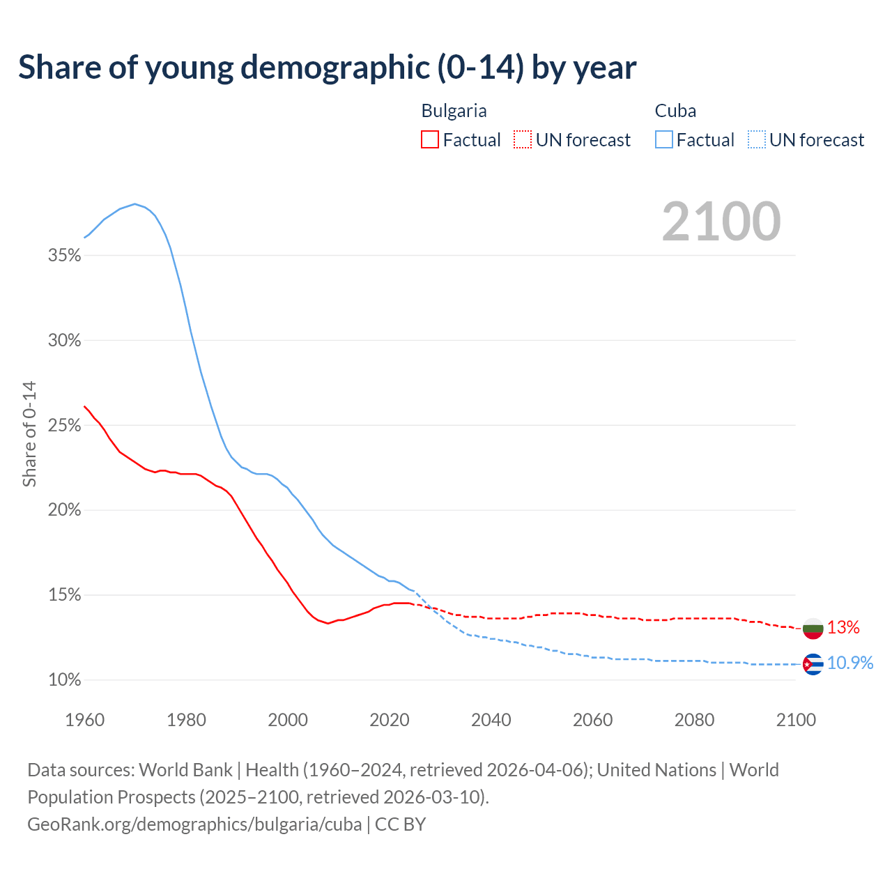 - The share of young demographic (0-15 years old) in Bulgaria is 14.5% vs 15.3% in Cuba.