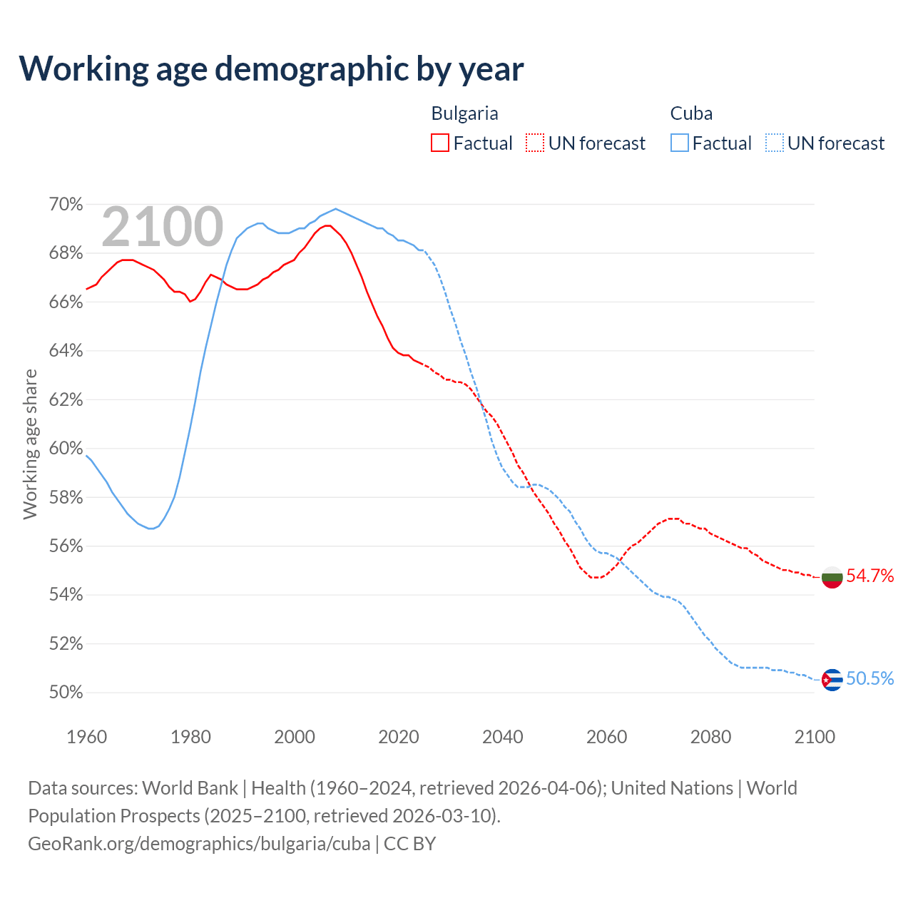 - Bulgaria has 4.04M working age adults (aged 15-64) vs 7.42M in Cuba.