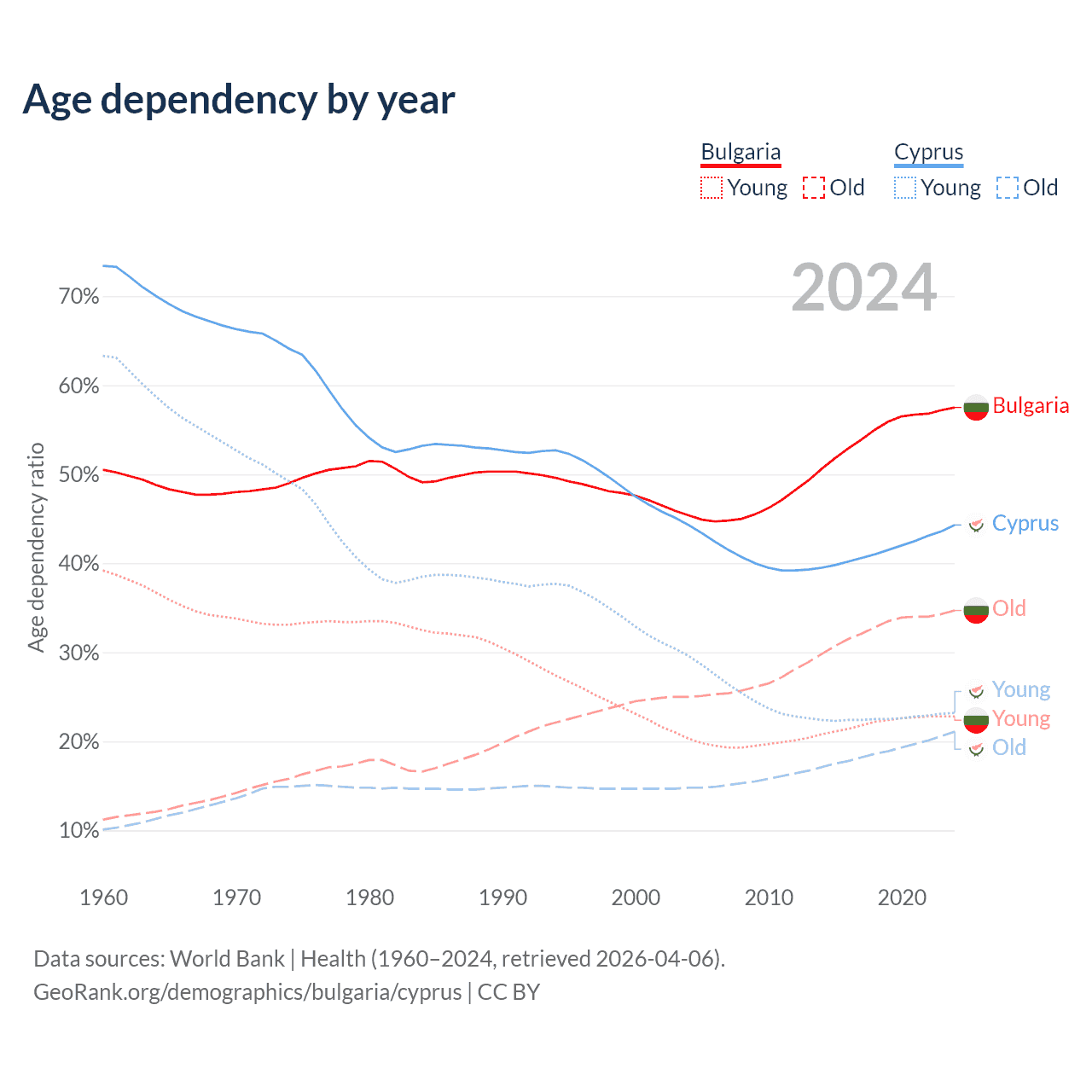 - Bulgaria is ranked 12/196 by median age (oldest to youngest) vs 52/196 for Cyprus.