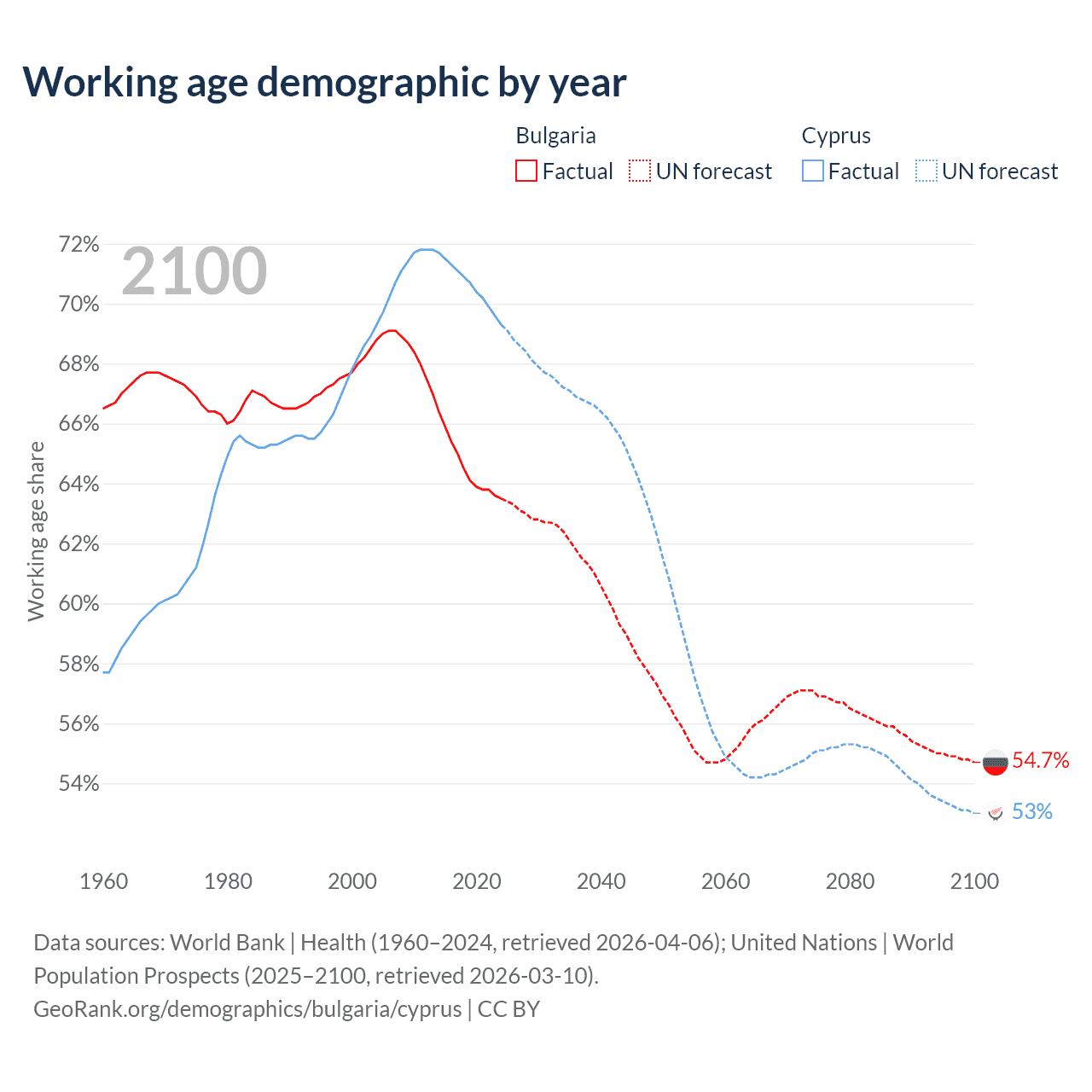 Median age Bulgaria vs Cyprus, 1960-2100