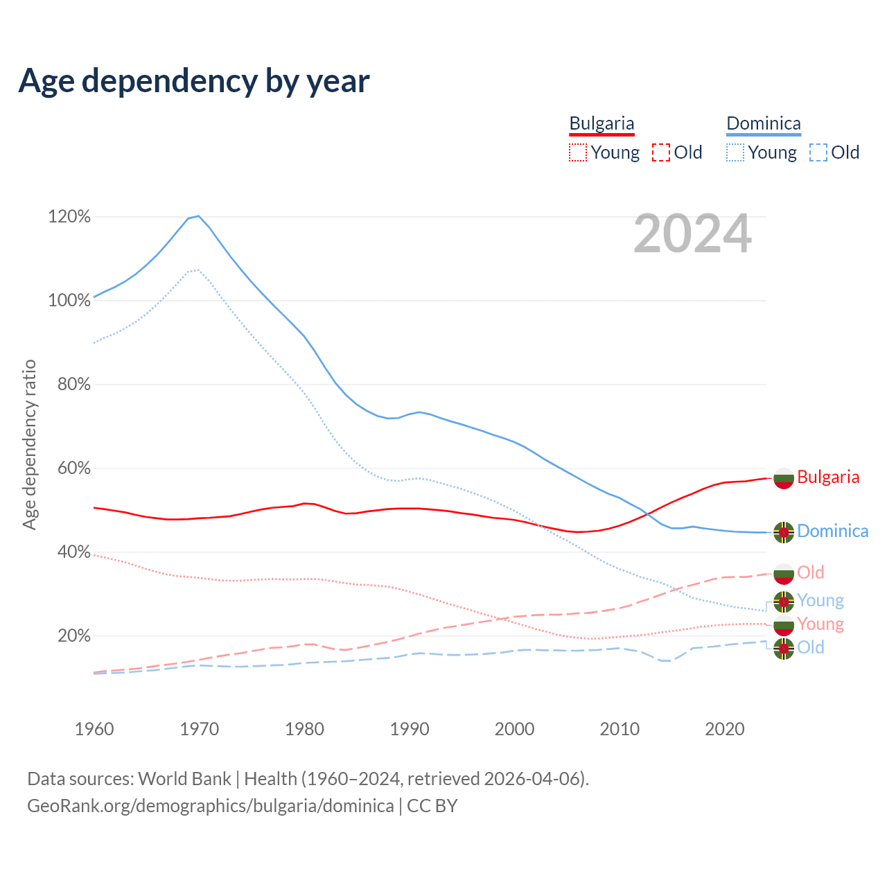- The share of old-age demographic (65+) in Bulgaria is 22% vs 13% in Dominica.