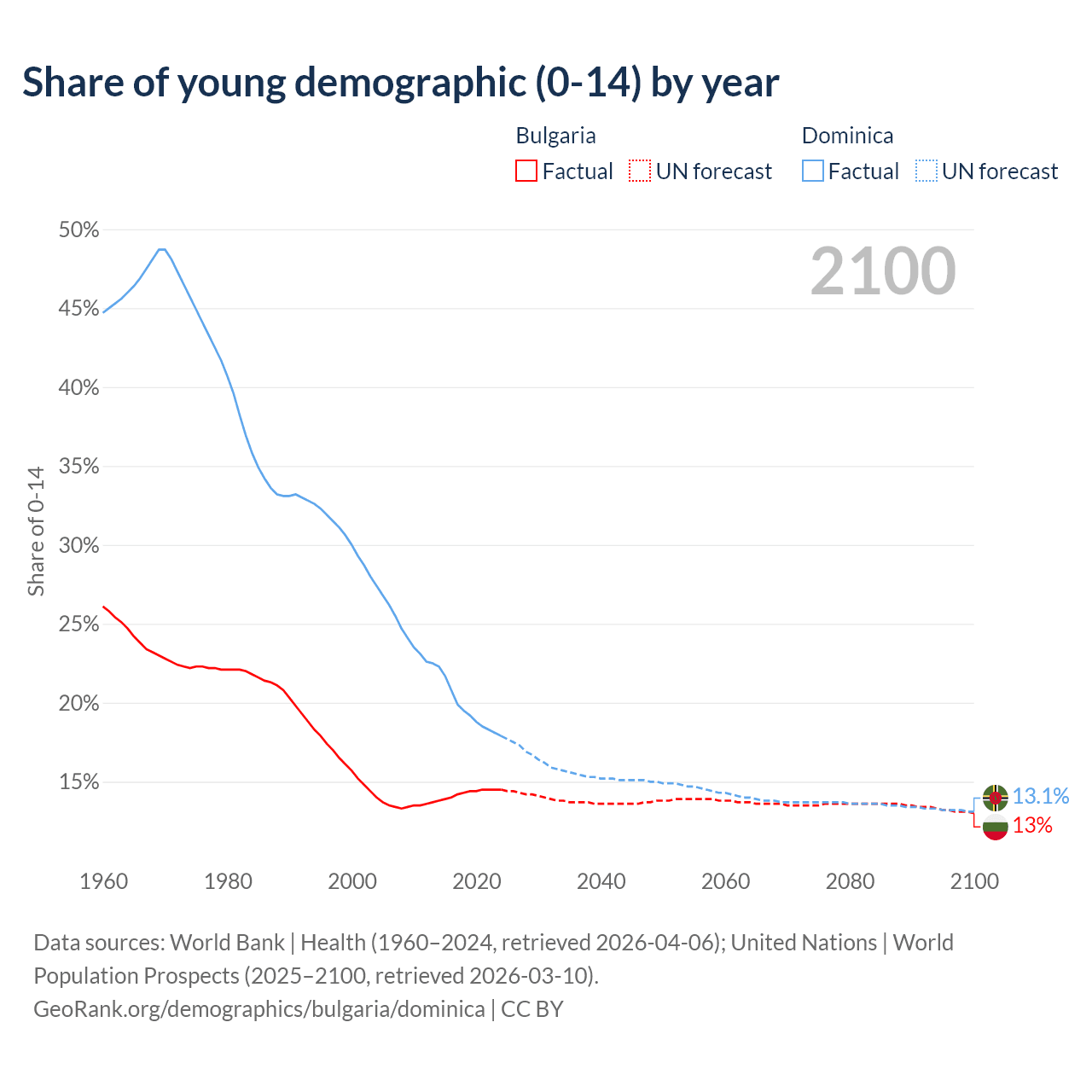 - The share of young demographic (0-15 years old) in Bulgaria is 14.5% vs 17.9% in Dominica.