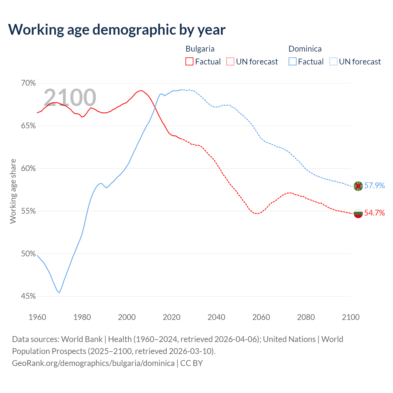 - Bulgaria has 4.04M working age adults (aged 15-64) vs 45.3K in Dominica.