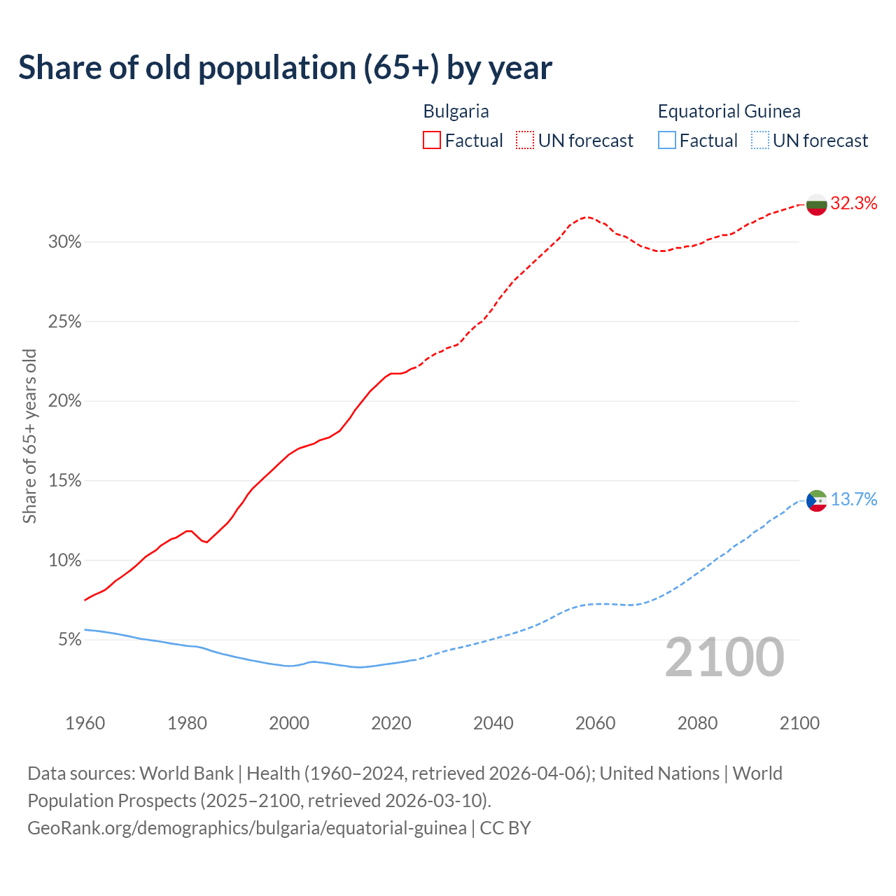 The share of older people aged 65 and over is 22% in Bulgaria and 3.69% in Equatorial Guinea. Life expectancy in Bulgaria compared to Equatorial Guinea .