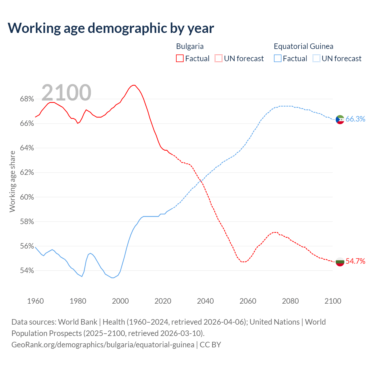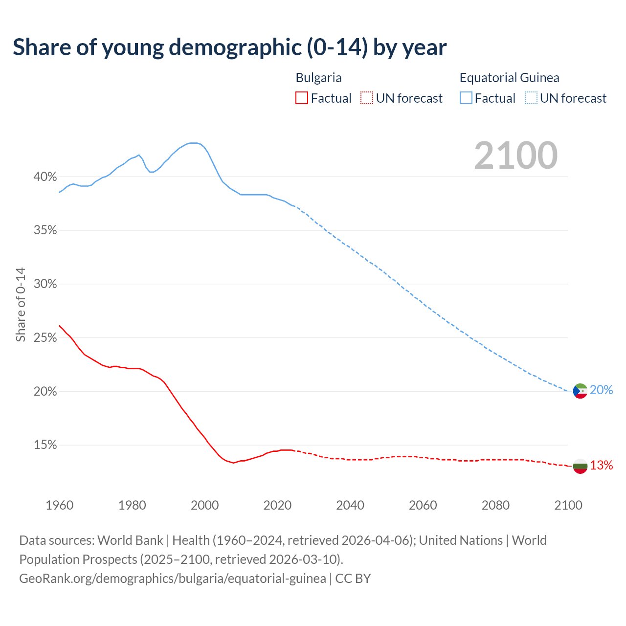 Median age Bulgaria vs Equatorial Guinea, 1960-2100