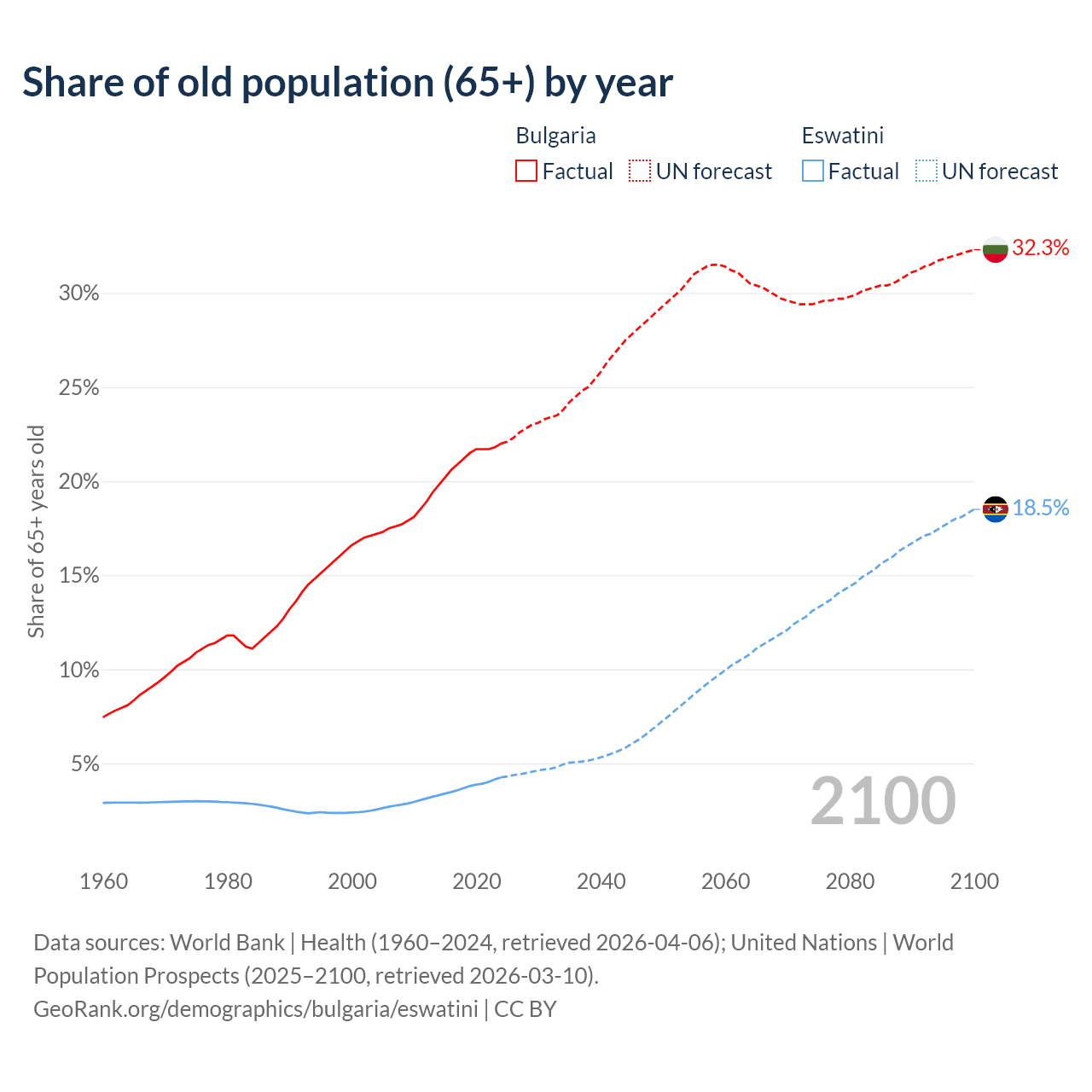 The share of older people aged 65 and over is 22% in Bulgaria and 4.26% in Eswatini. Life expectancy in Bulgaria compared to Eswatini .