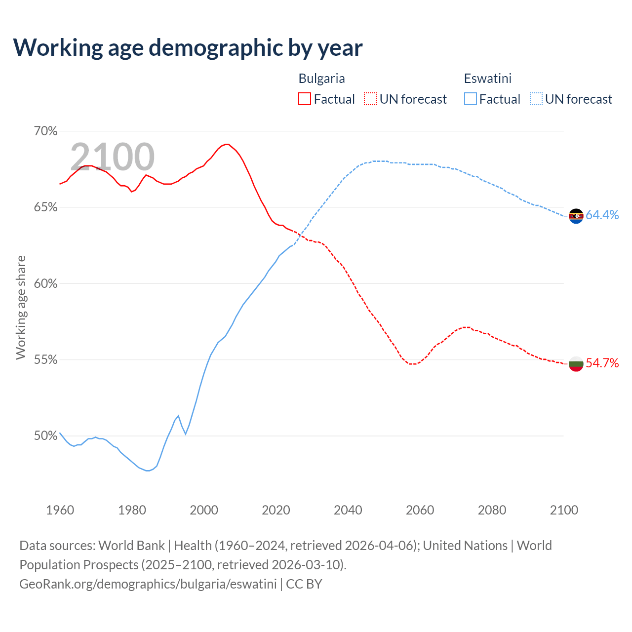 Median age Bulgaria vs Eswatini, 1960-2100