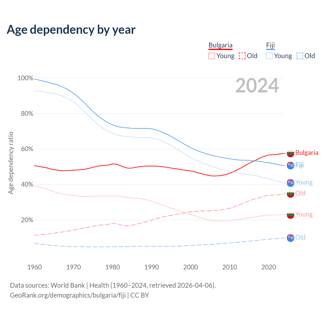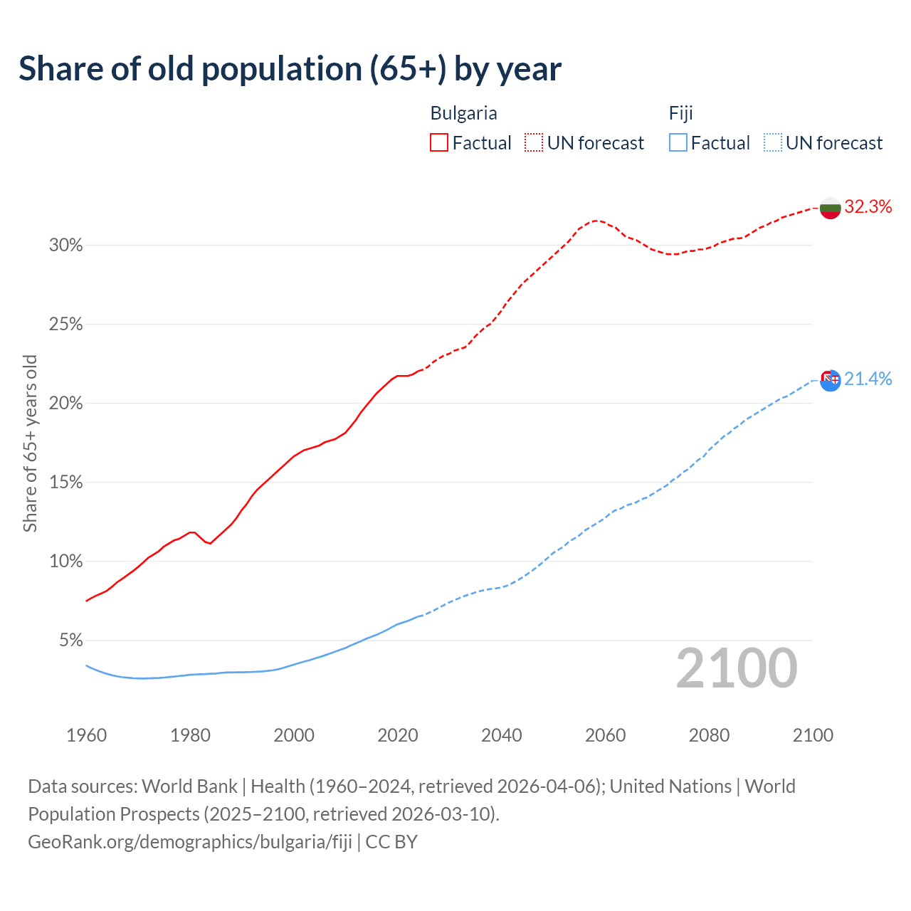 - The share of old-age demographic (65+) in Bulgaria is 22% vs 6.49% in Fiji.
