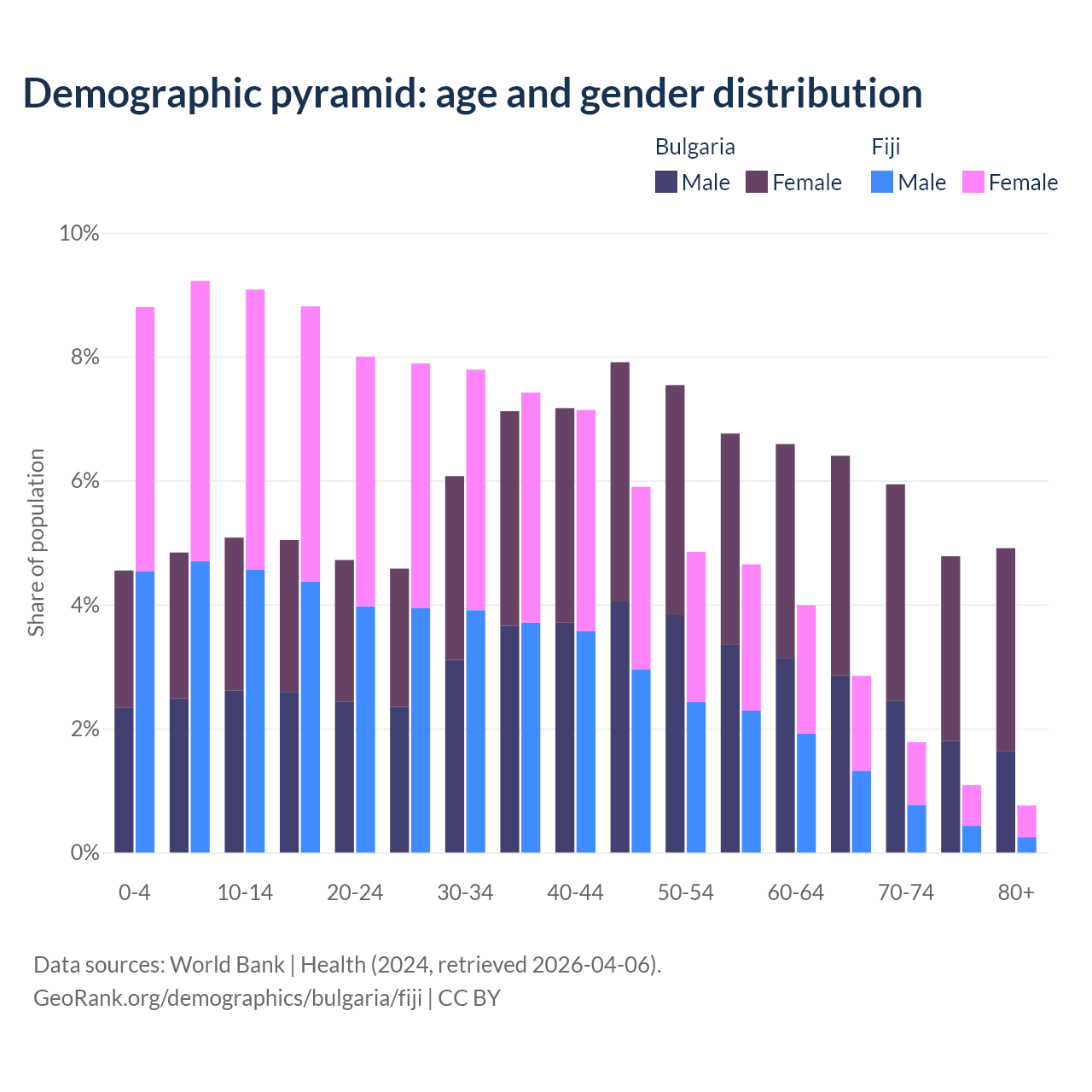 - As of 2026, the population of Bulgaria is 6.36M vs 939K in Fiji - 6.78 times difference.