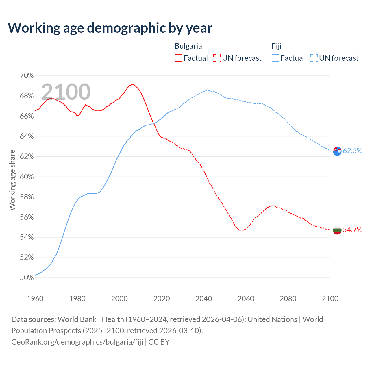 - Bulgaria has 4.04M working age adults (aged 15-64) vs 623K in Fiji.