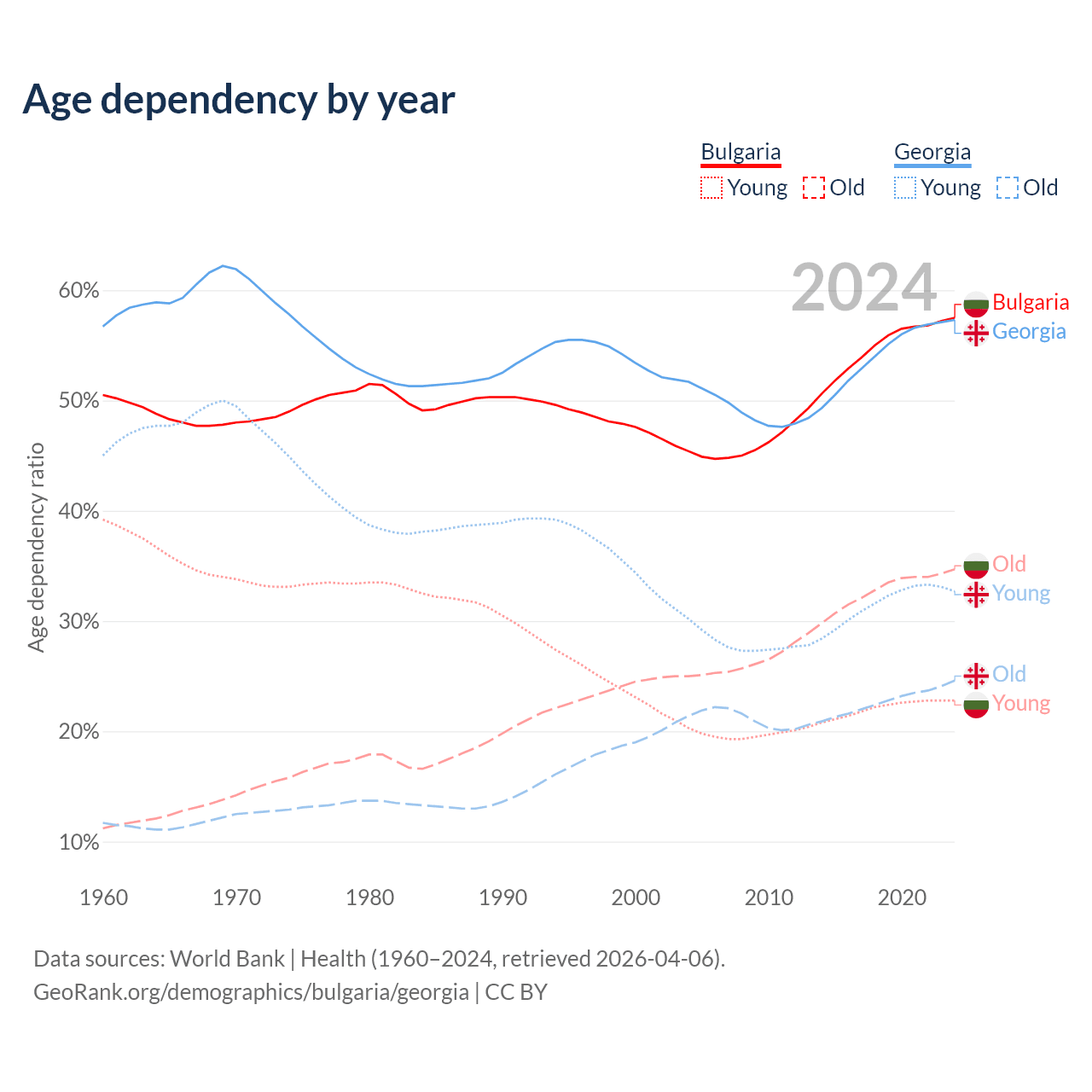 - Bulgaria is ranked 12/196 by median age (oldest to youngest) vs 59/196 for Georgia.