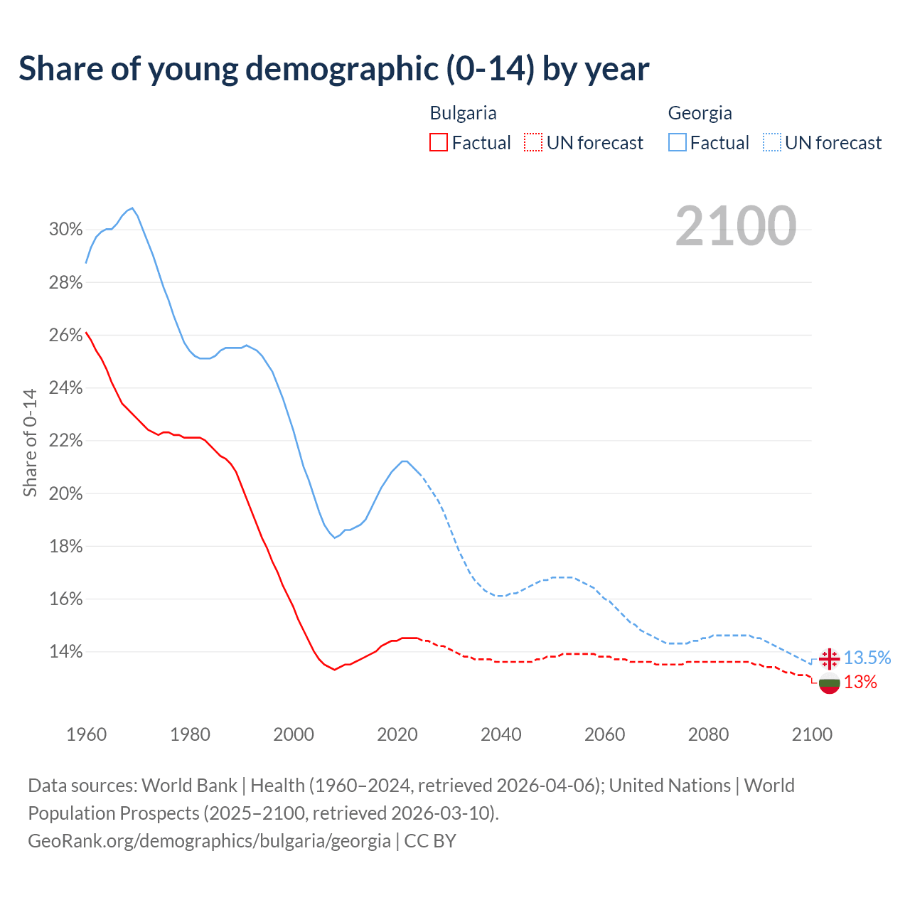 - The share of young demographic (0-15 years old) in Bulgaria is 14.5% vs 20.8% in Georgia.