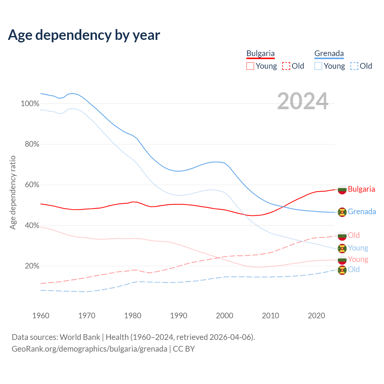 - The share of old-age demographic (65+) in Bulgaria is 22% vs 12.2% in Grenada.