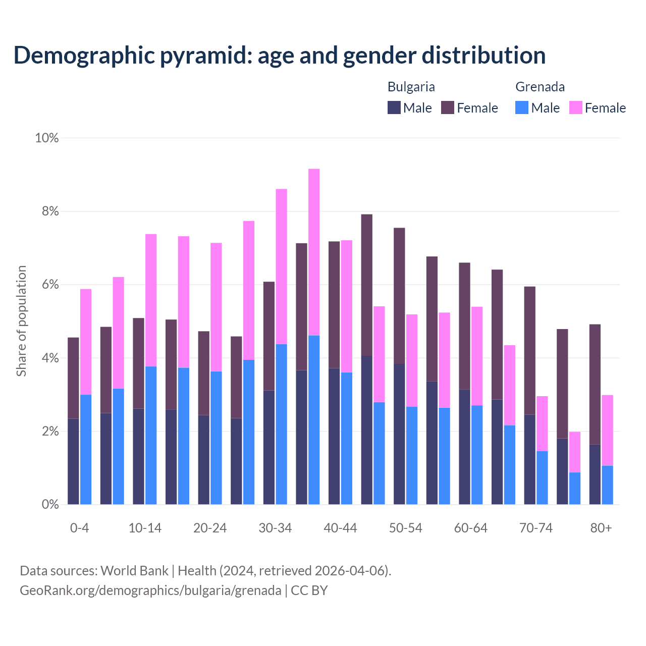 - Bulgaria is ranked 12/196 by median age (oldest to youngest) vs 77/196 for Grenada.
