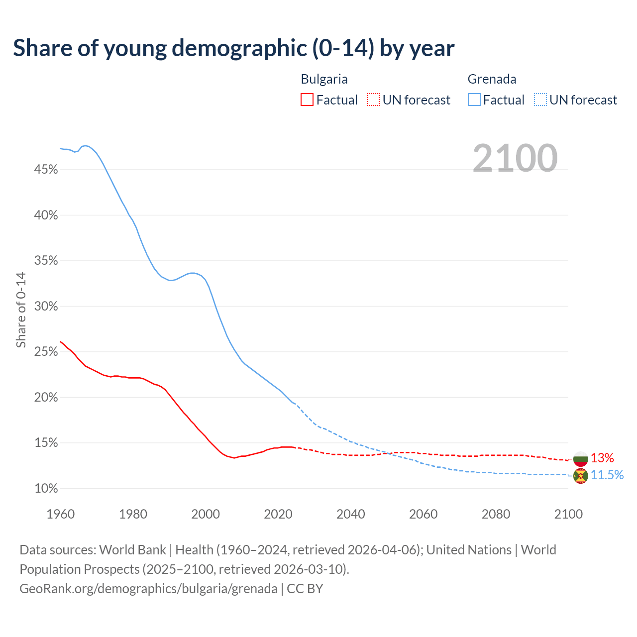 - The share of young demographic (0-15 years old) in Bulgaria is 14.5% vs 19.4% in Grenada.