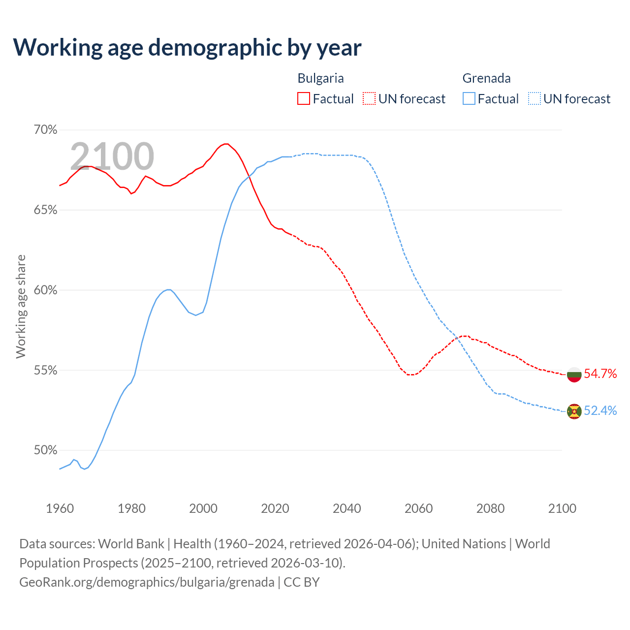 - Bulgaria has 4.04M working age adults (aged 15-64) vs 80.2K in Grenada.