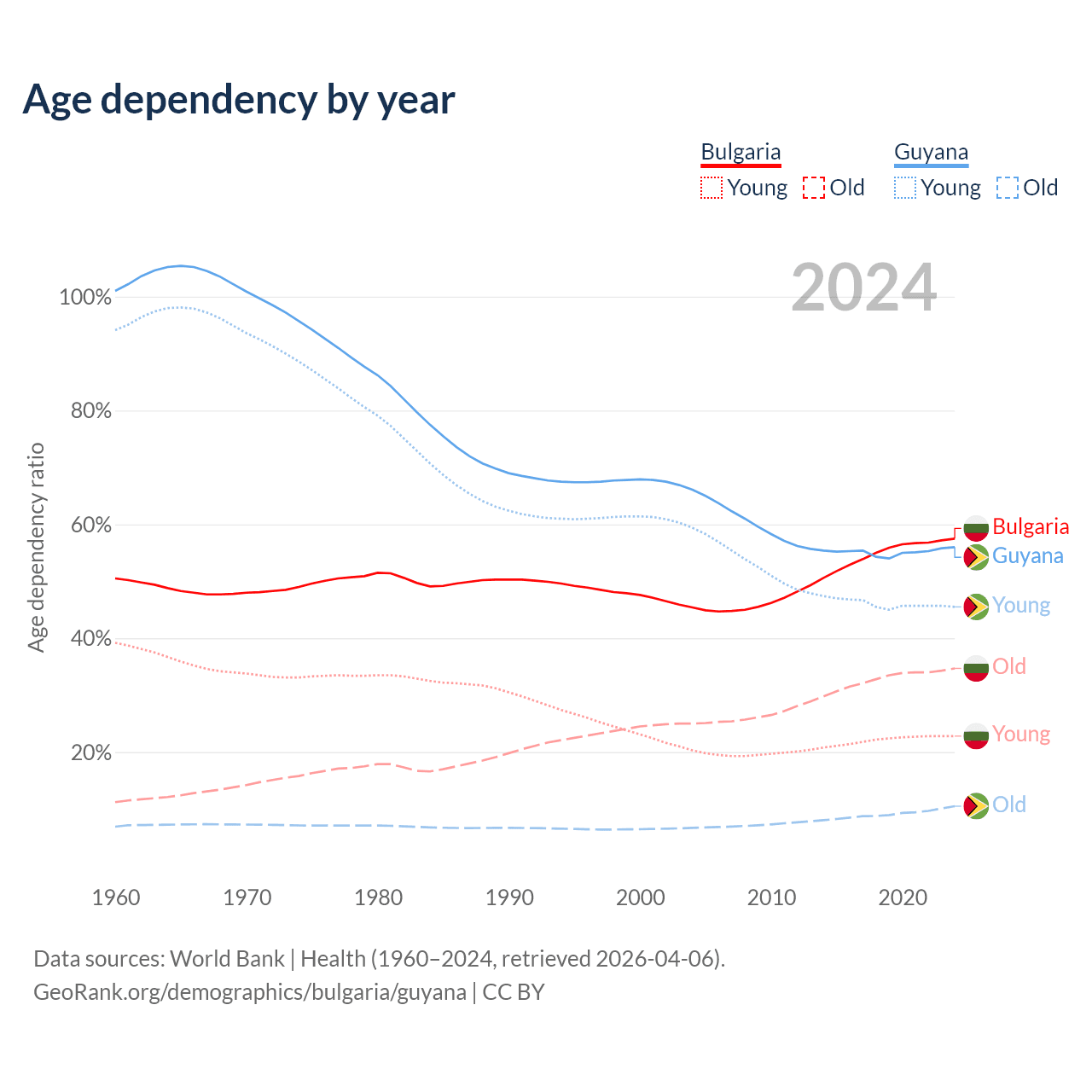 - The share of old-age demographic (65+) in Bulgaria is 22% vs 6.73% in Guyana.