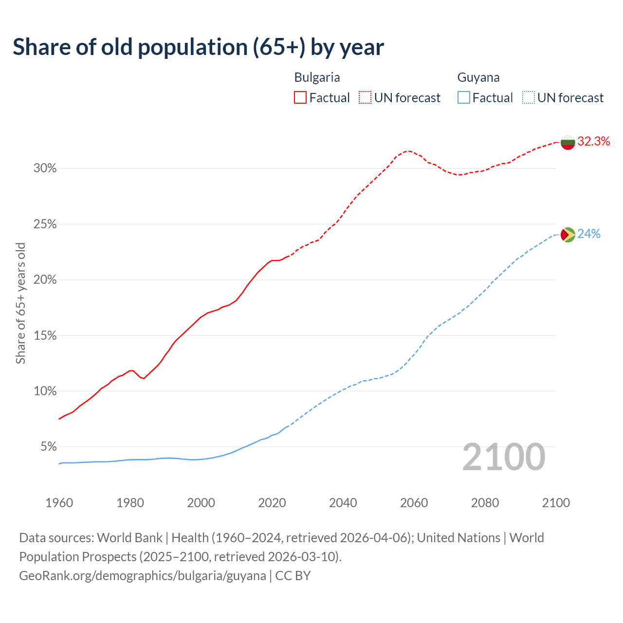 The share of older people aged 65 and over is 22% in Bulgaria and 6.73% in Guyana. Life expectancy in Bulgaria compared to Guyana .