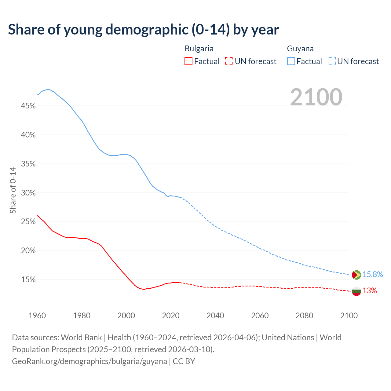 - The share of young demographic (0-15 years old) in Bulgaria is 14.5% vs 29.2% in Guyana.