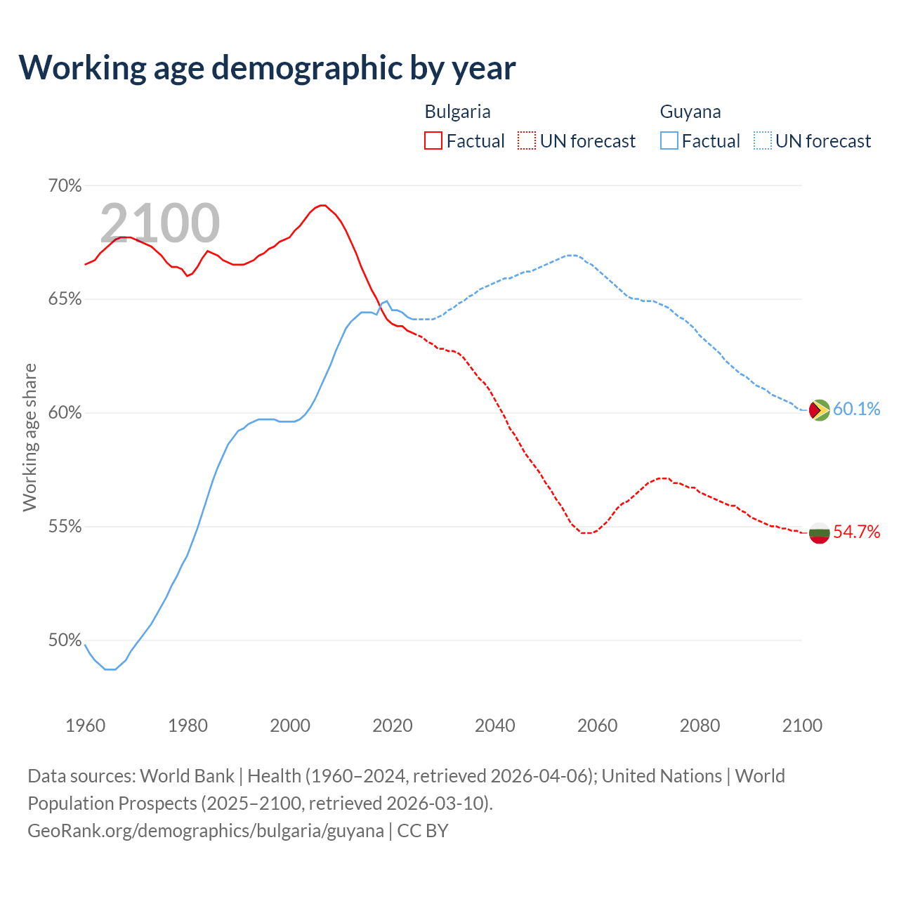 - Bulgaria has 4.04M working age adults (aged 15-64) vs 540K in Guyana.