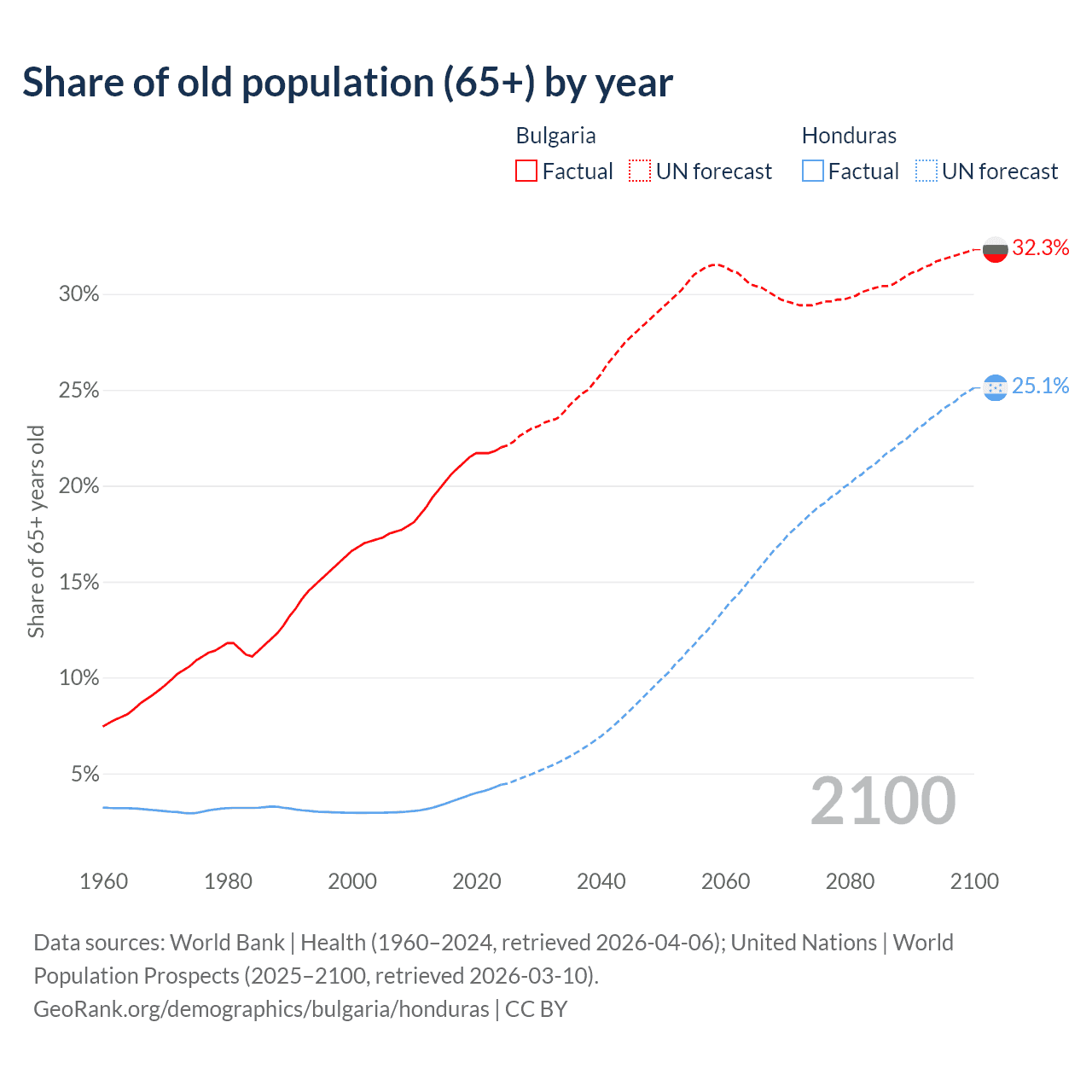The share of older people aged 65 and over is 22% in Bulgaria and 4.42% in Honduras. Life expectancy in Bulgaria compared to Honduras .