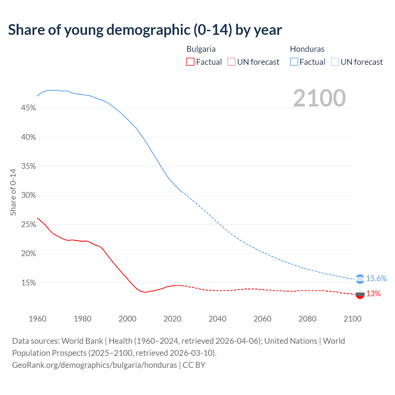 - The share of young demographic (0-15 years old) in Bulgaria is 14.5% vs 30.6% in Honduras.