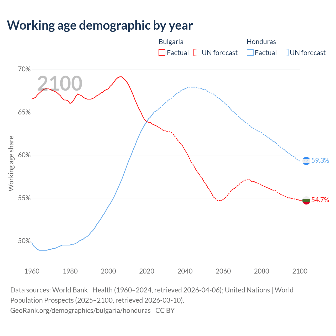 - Bulgaria has 4.04M working age adults (aged 15-64) vs 7.3M in Honduras.