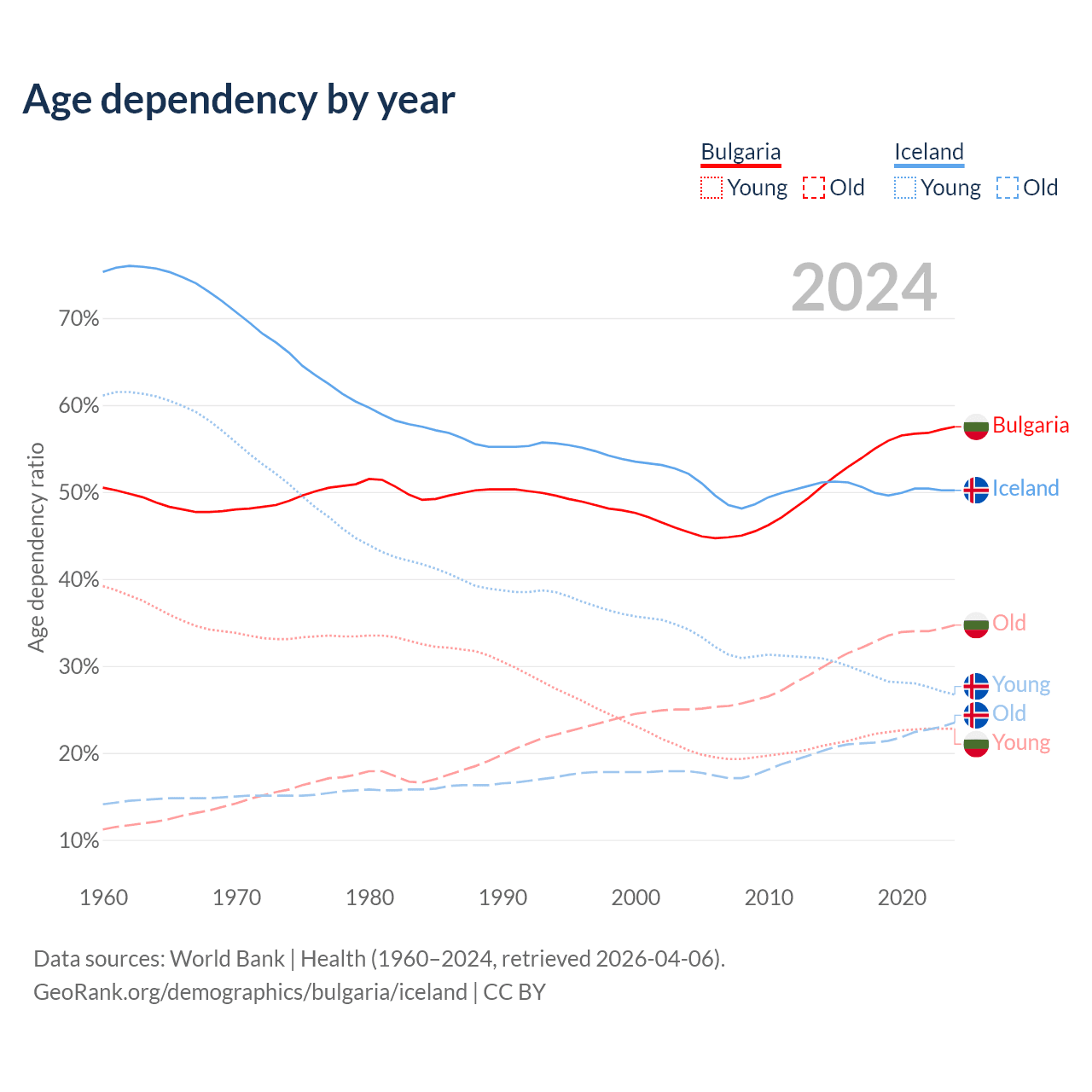 - Bulgaria is ranked 12/196 by median age (oldest to youngest) vs 65/196 for Iceland.