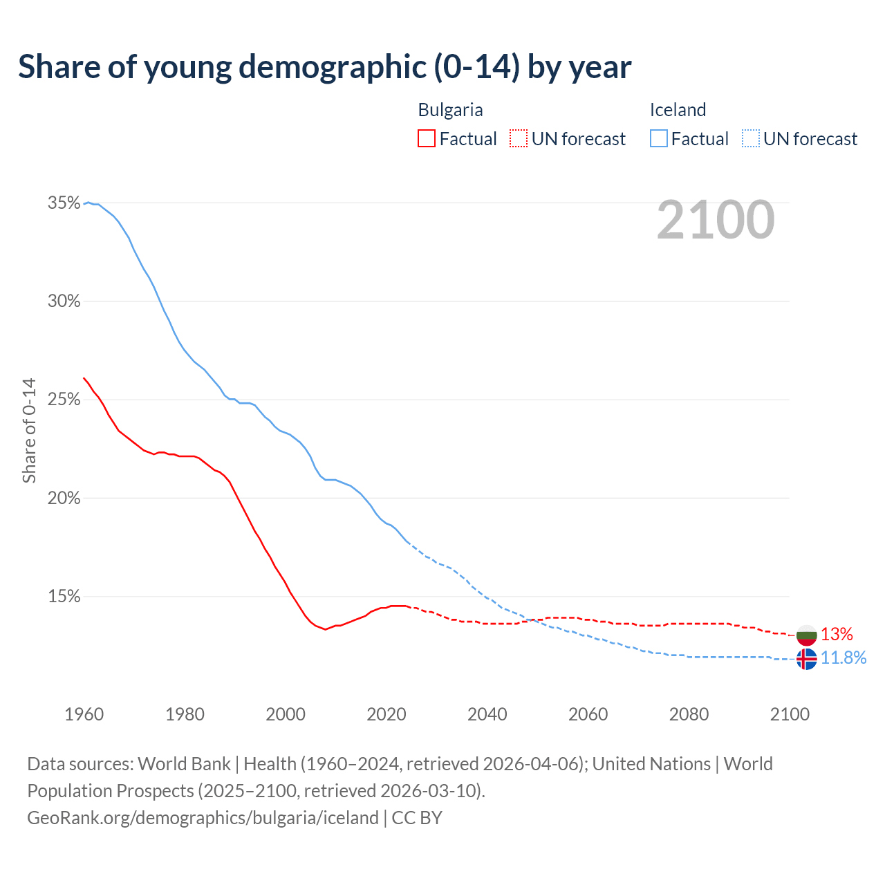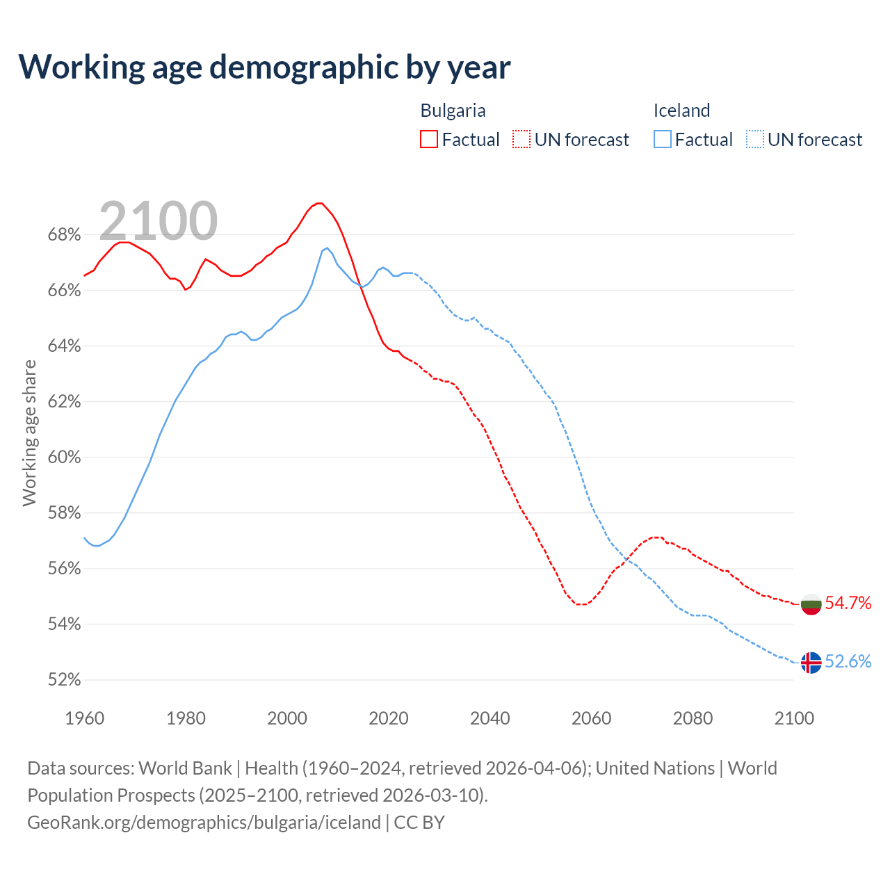Median age Bulgaria vs Iceland, 1960-2100