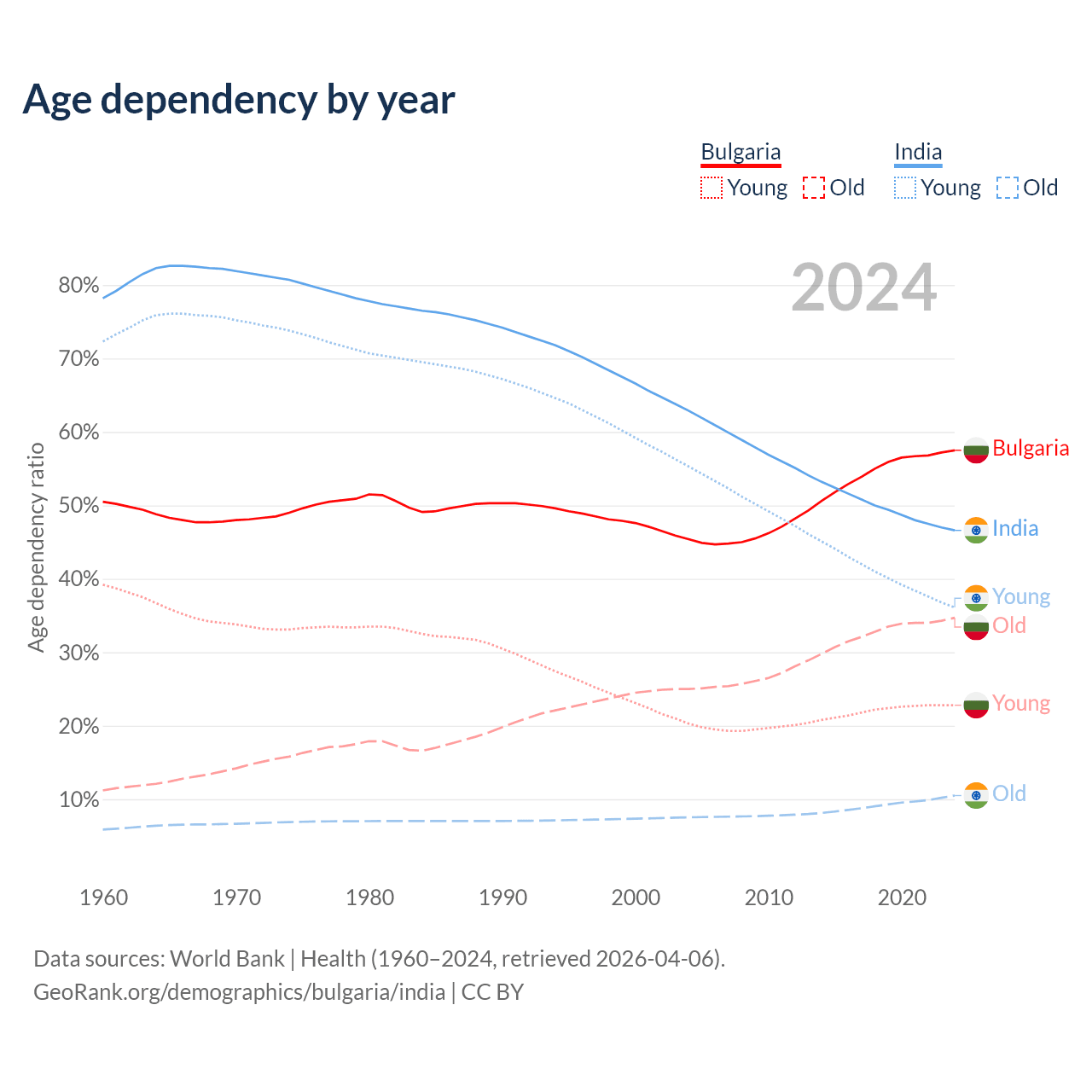 - Bulgaria is ranked 12/196 by median age (oldest to youngest) vs 108/196 for India.