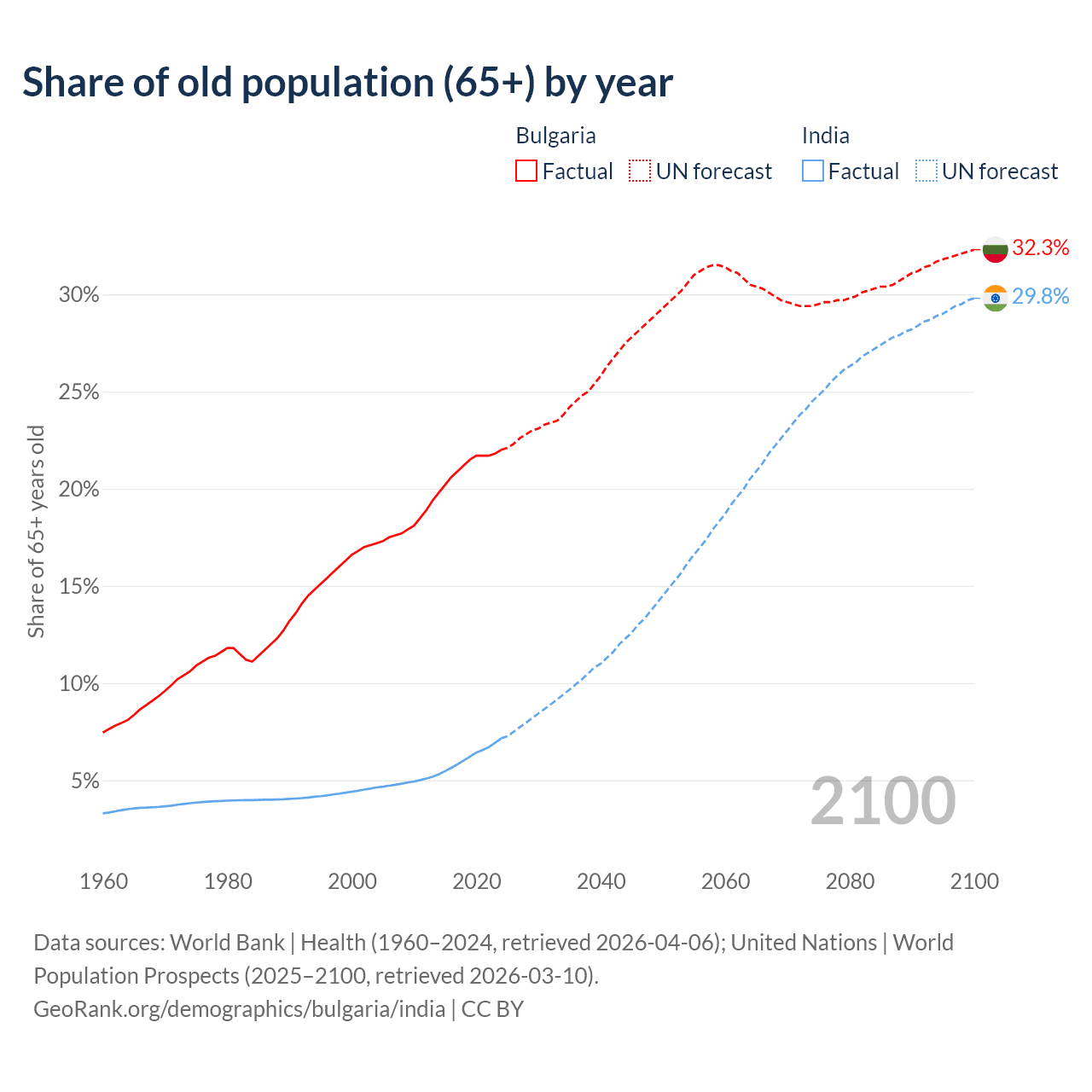 The share of older people aged 65 and over is 22% in Bulgaria and 7.15% in India. Life expectancy in Bulgaria compared to India .