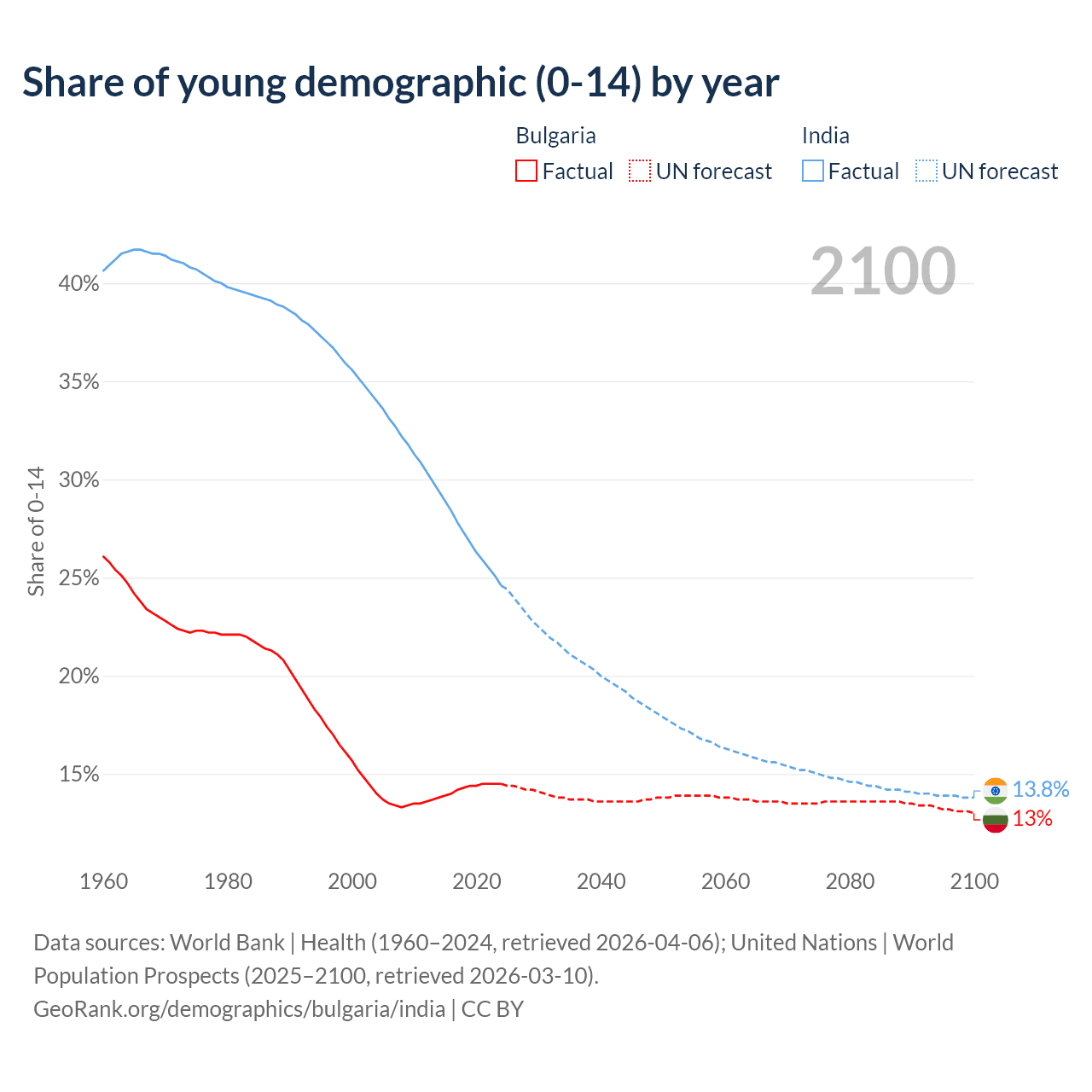 - The share of young demographic (0-15 years old) in Bulgaria is 14.5% vs 24.6% in India.