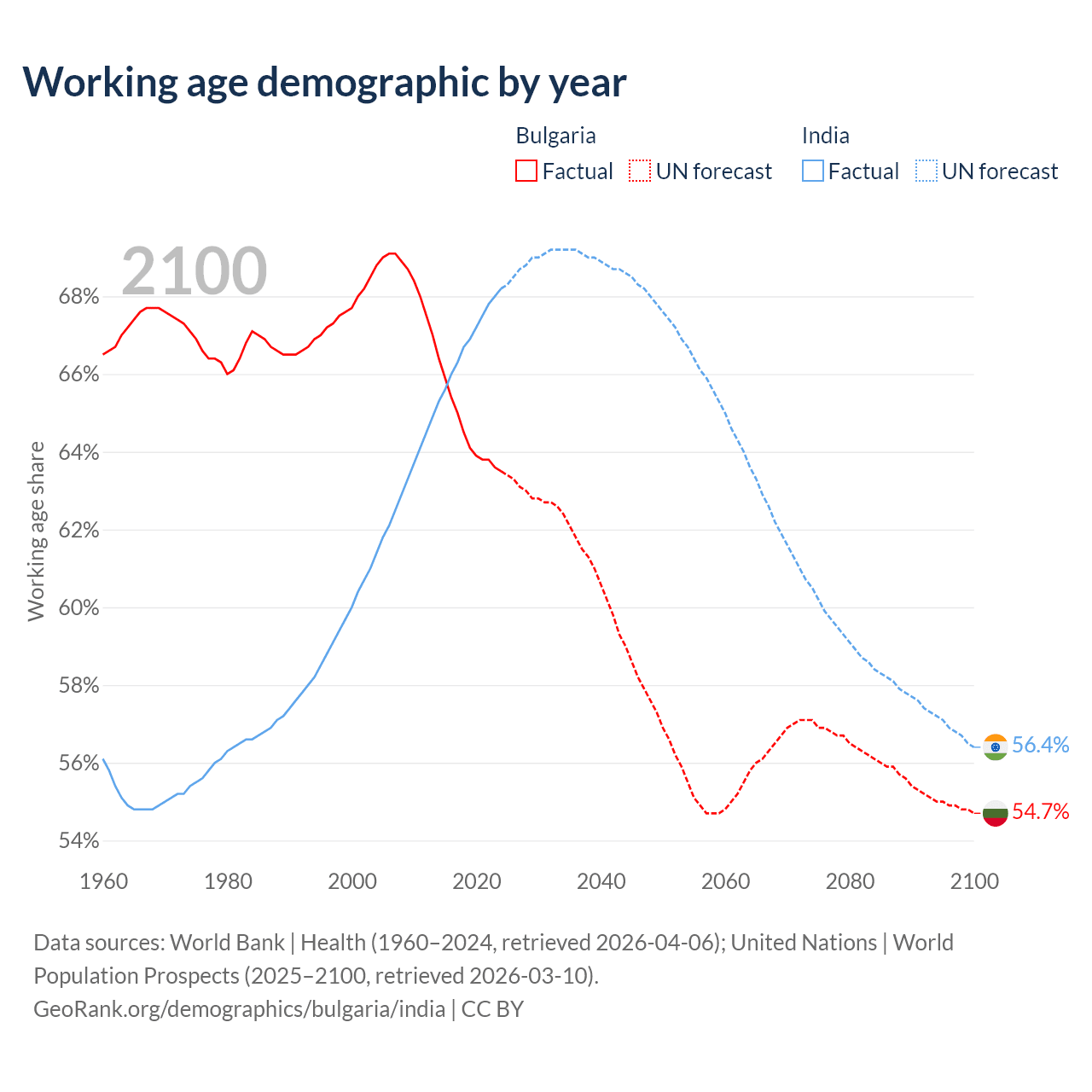 Median age Bulgaria vs India, 1960-2100