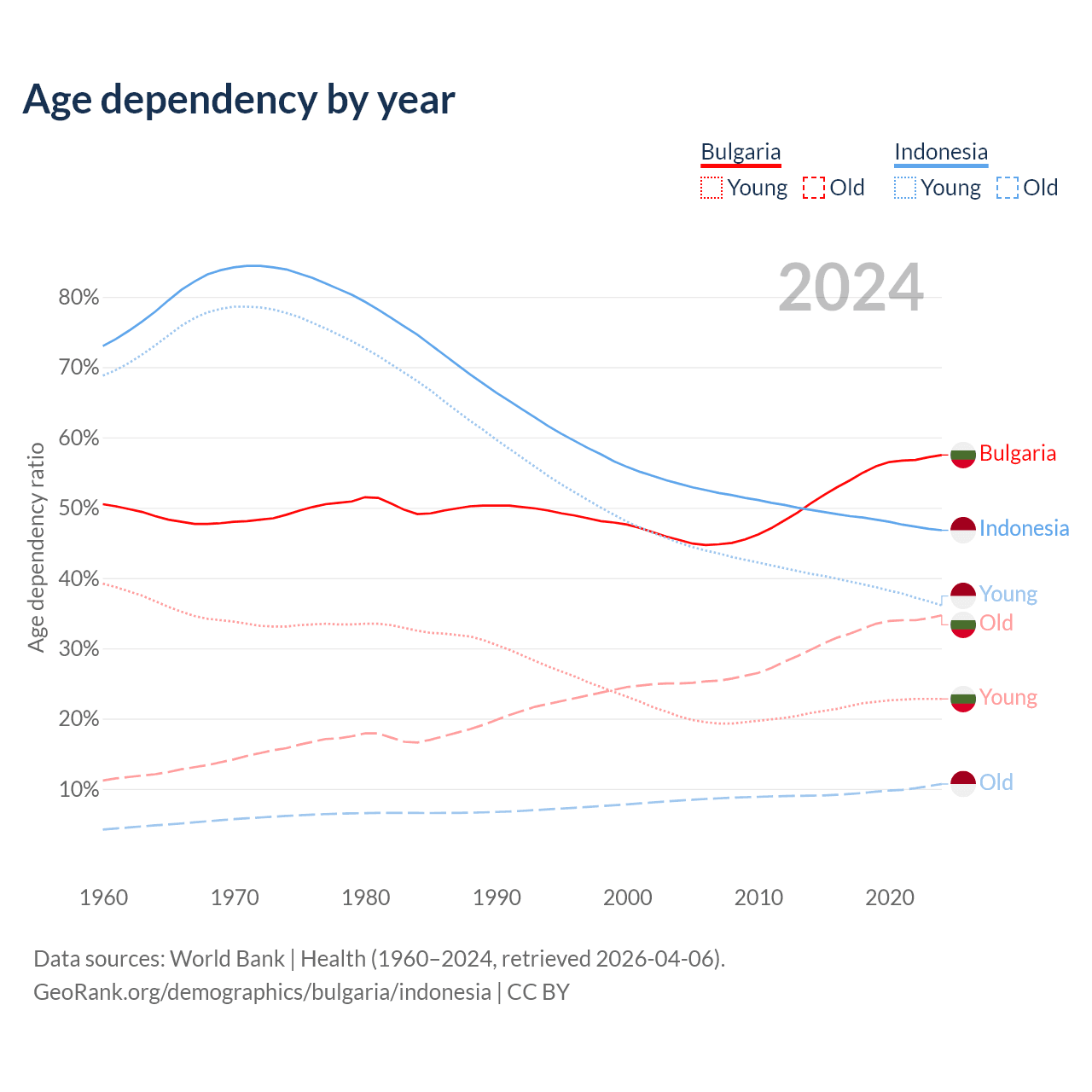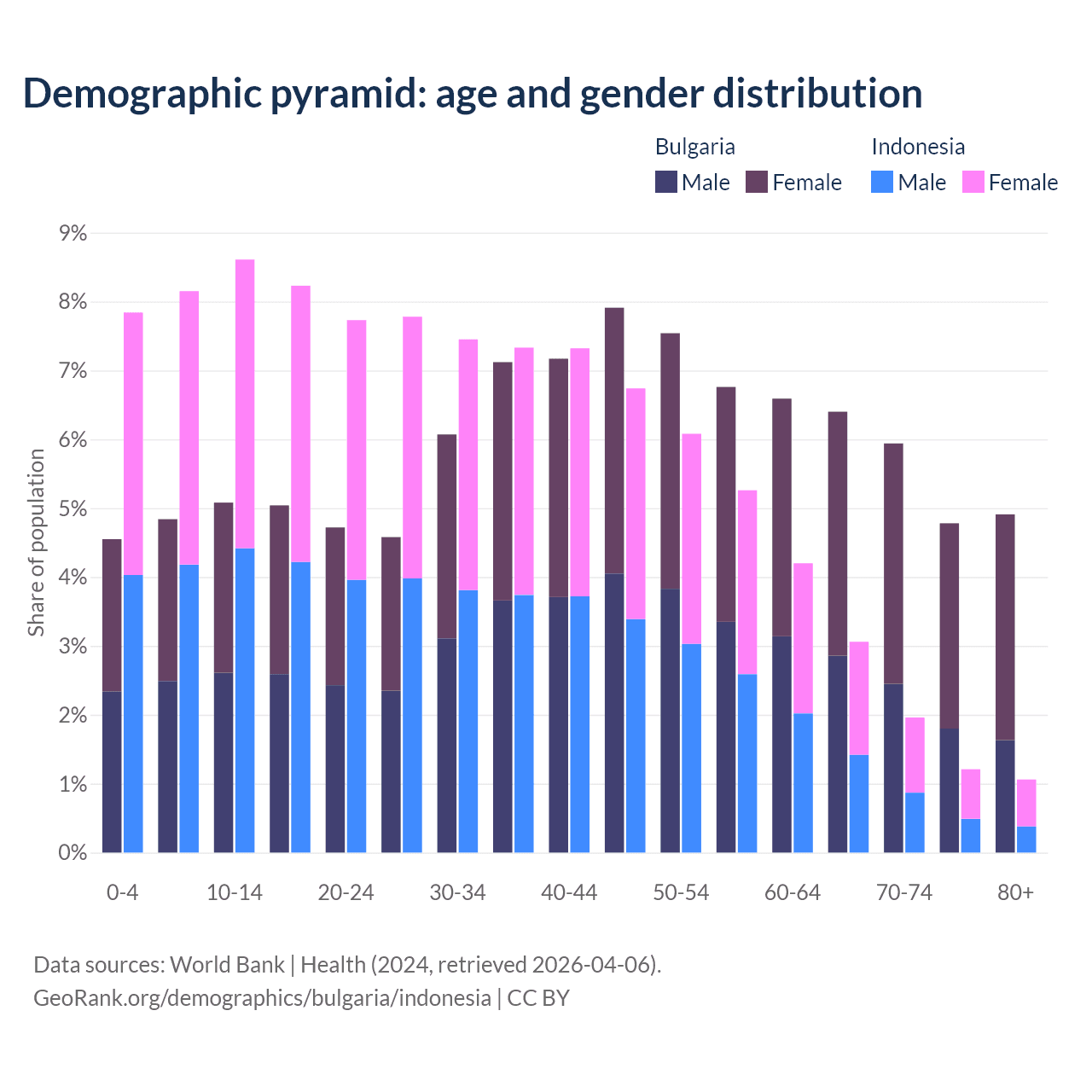 - Bulgaria is ranked 12/196 by median age (oldest to youngest) vs 93/196 for Indonesia.