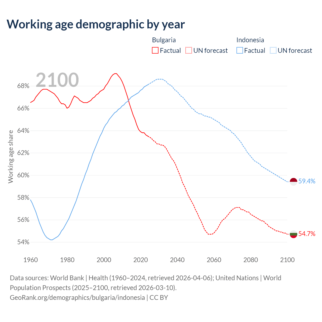 - Bulgaria has 4.04M working age adults (aged 15-64) vs 197M in Indonesia.