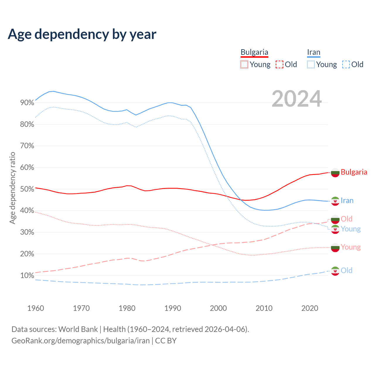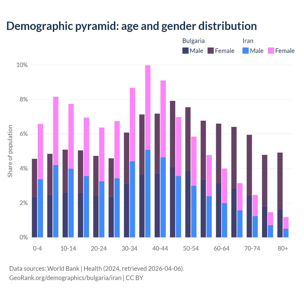 - Bulgaria is ranked 12/196 by median age (oldest to youngest) vs 79/196 for Iran.