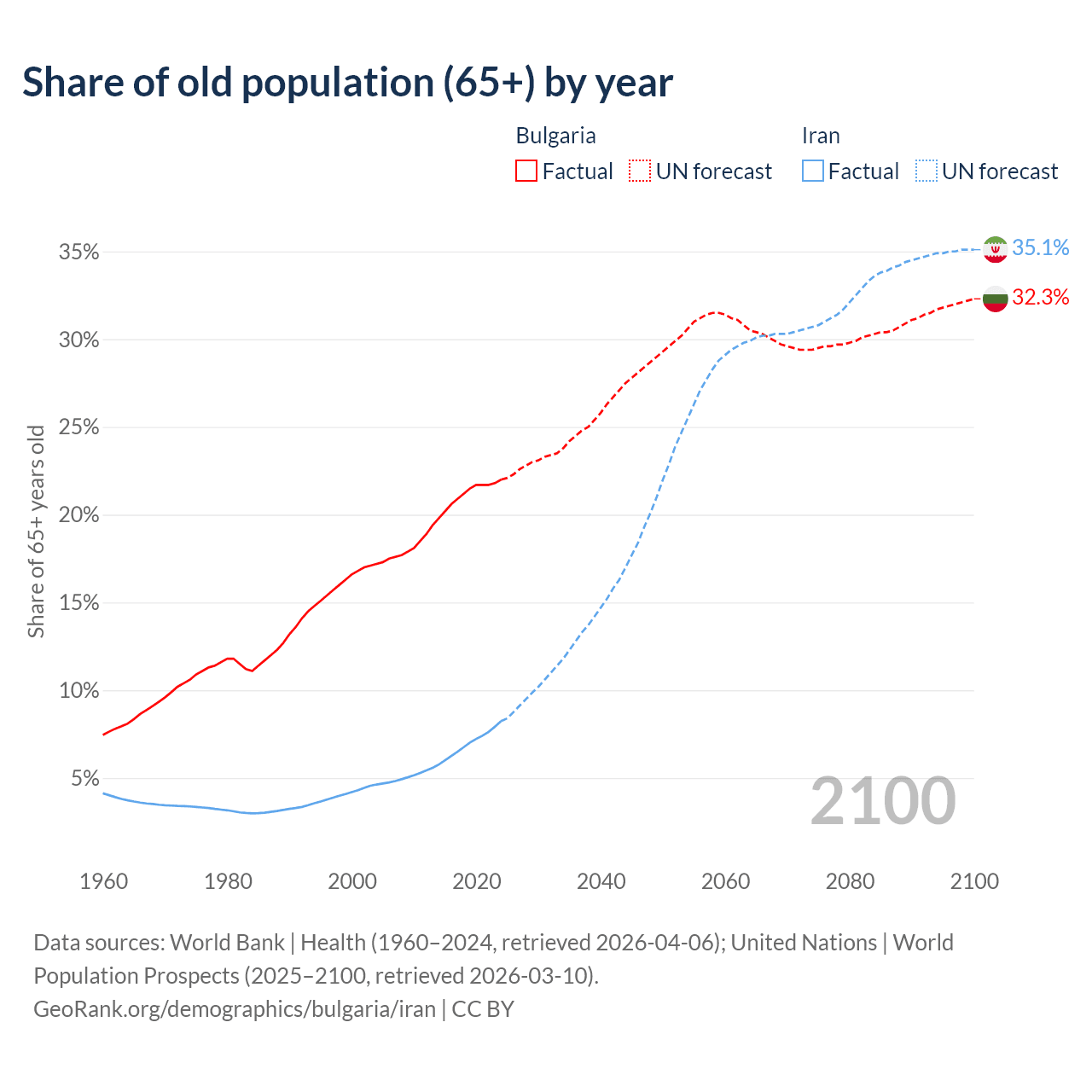 The share of older people aged 65 and over is 22% in Bulgaria and 8.24% in Iran. Life expectancy in Bulgaria compared to Iran .