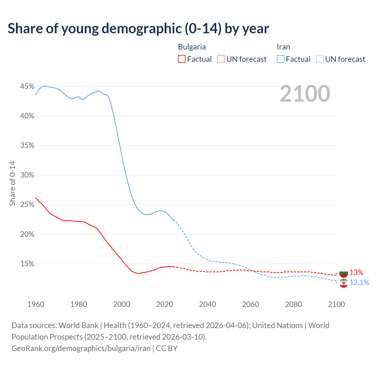 - The share of young demographic (0-15 years old) in Bulgaria is 14.5% vs 22.4% in Iran.