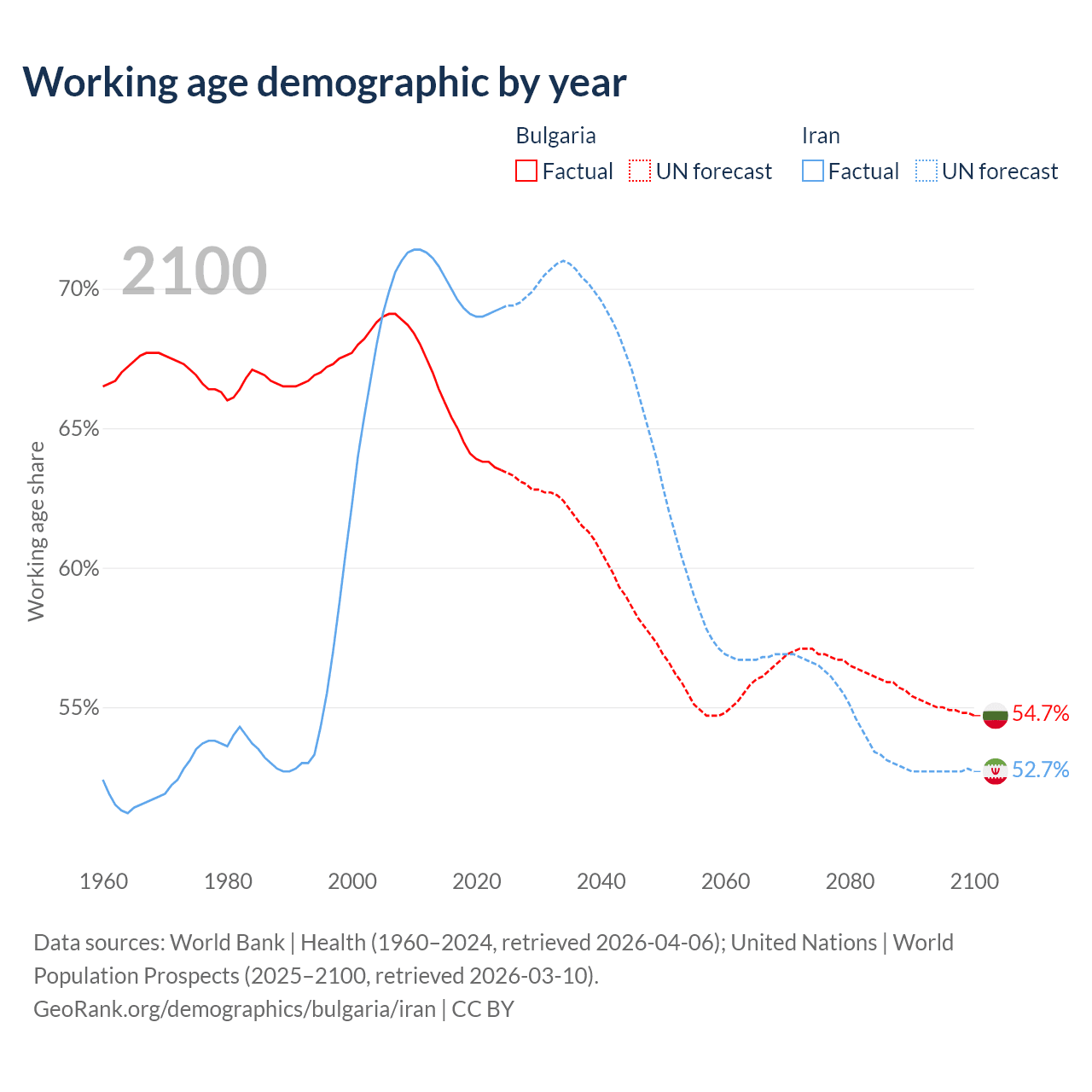 - Bulgaria has 4.04M working age adults (aged 15-64) vs 64.8M in Iran.