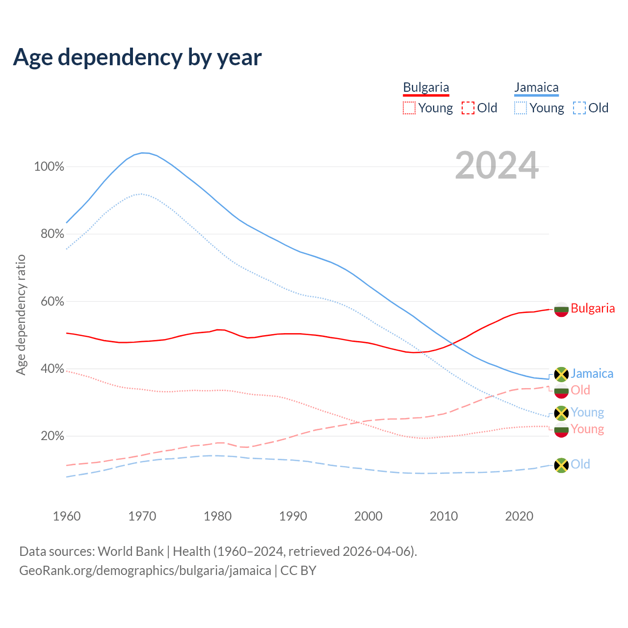 - The share of old-age demographic (65+) in Bulgaria is 22% vs 8.21% in Jamaica.