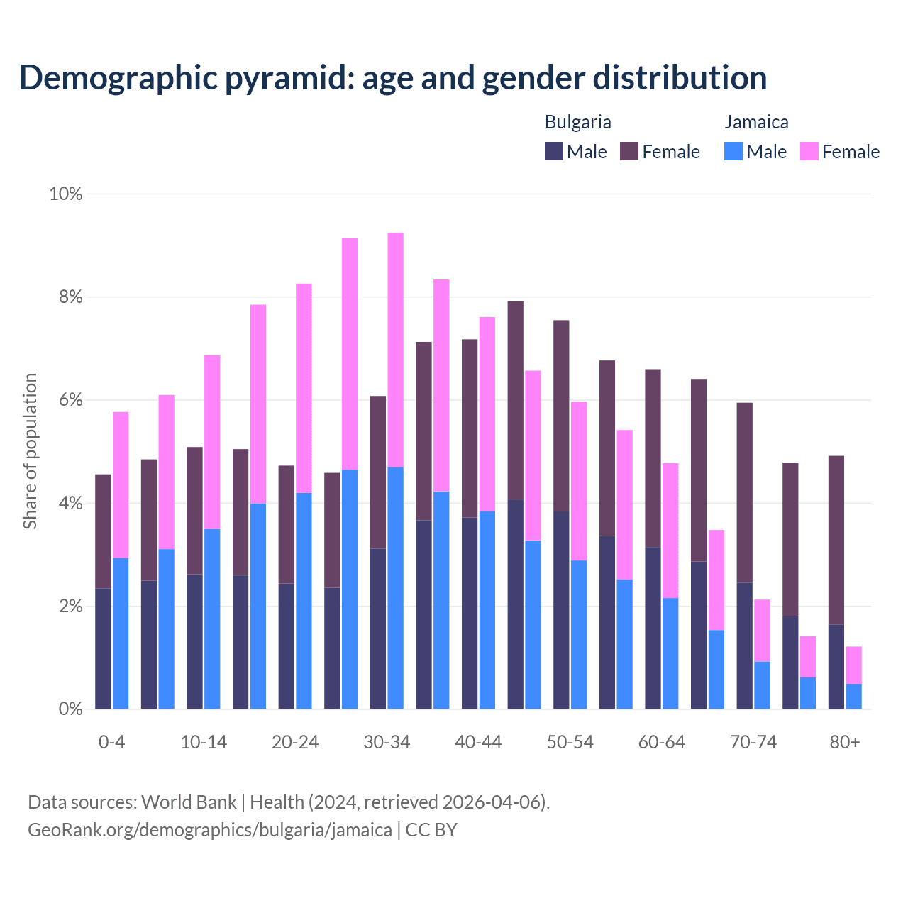 - As of 2026, the population of Bulgaria is 6.36M vs 2.83M in Jamaica - 2.24 times difference.