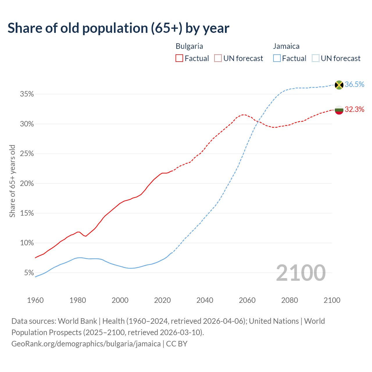 The share of older people aged 65 and over is 22% in Bulgaria and 8.21% in Jamaica. Life expectancy in Bulgaria compared to Jamaica .