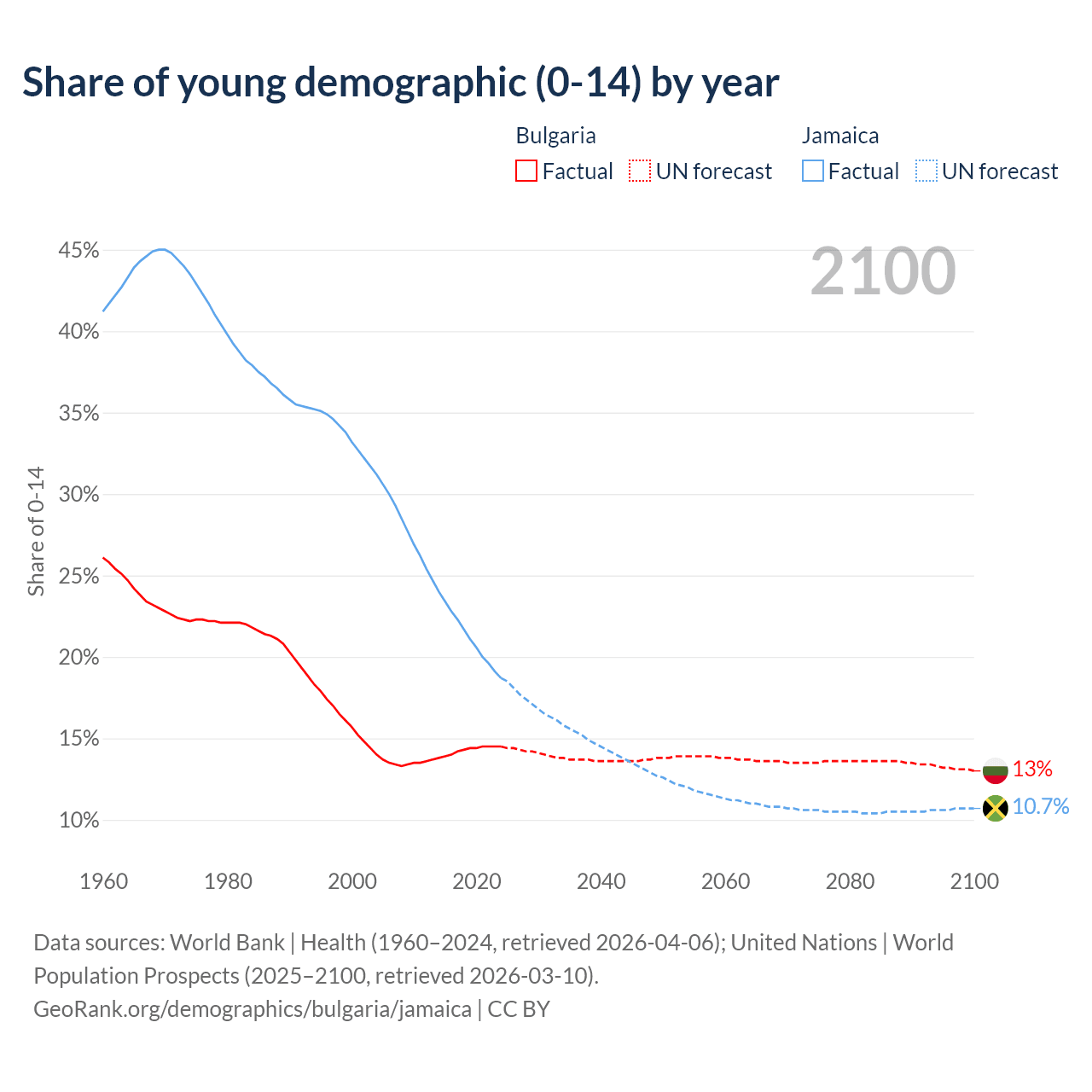 - The share of young demographic (0-15 years old) in Bulgaria is 14.5% vs 18.7% in Jamaica.