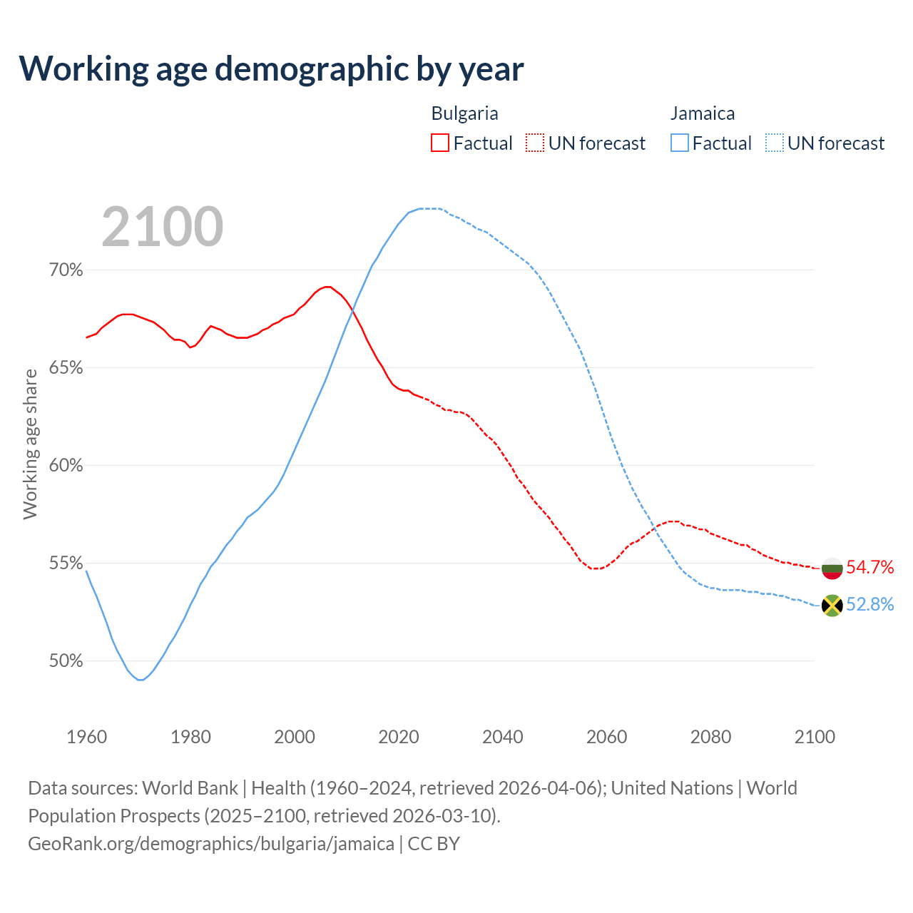 - Bulgaria has 4.04M working age adults (aged 15-64) vs 2.07M in Jamaica.