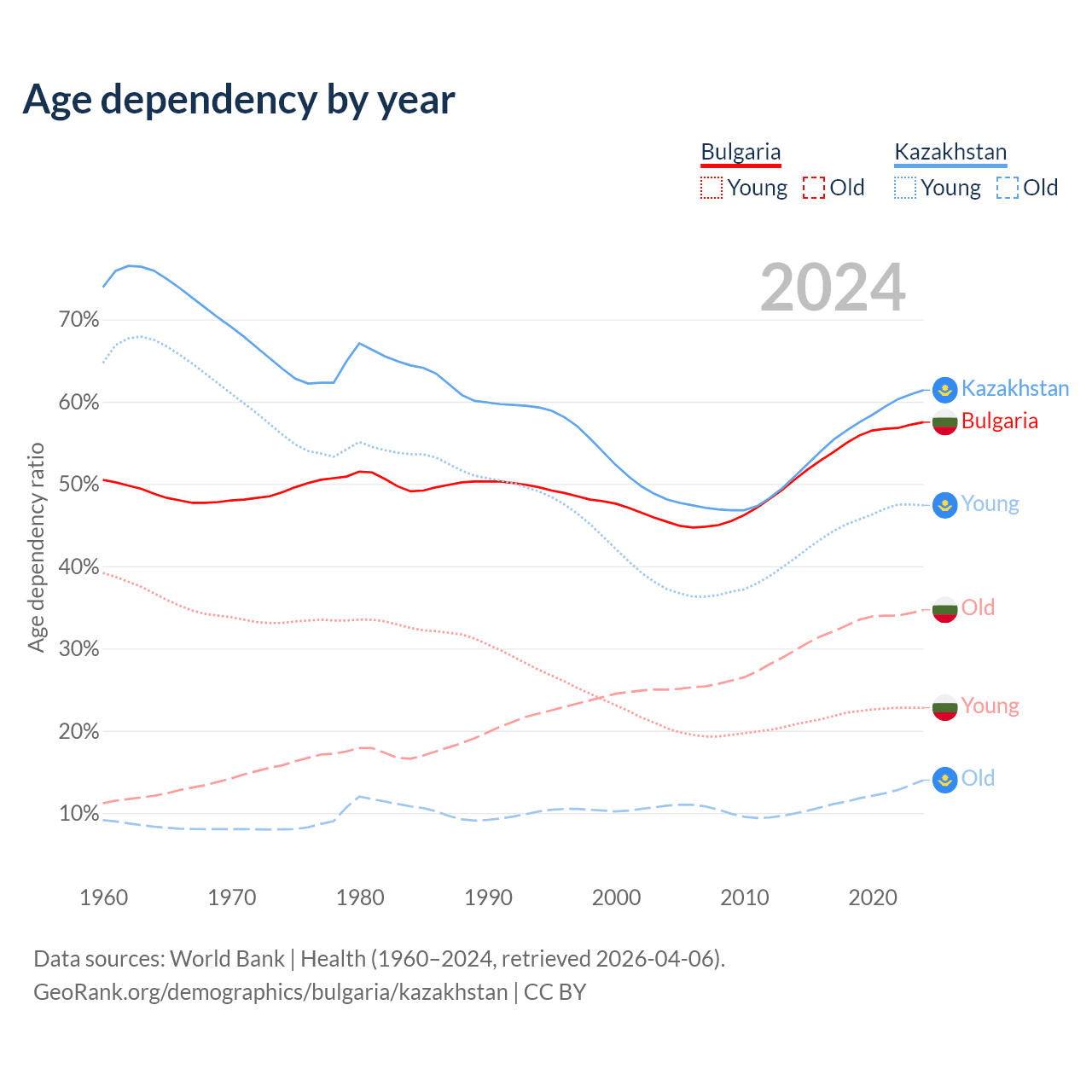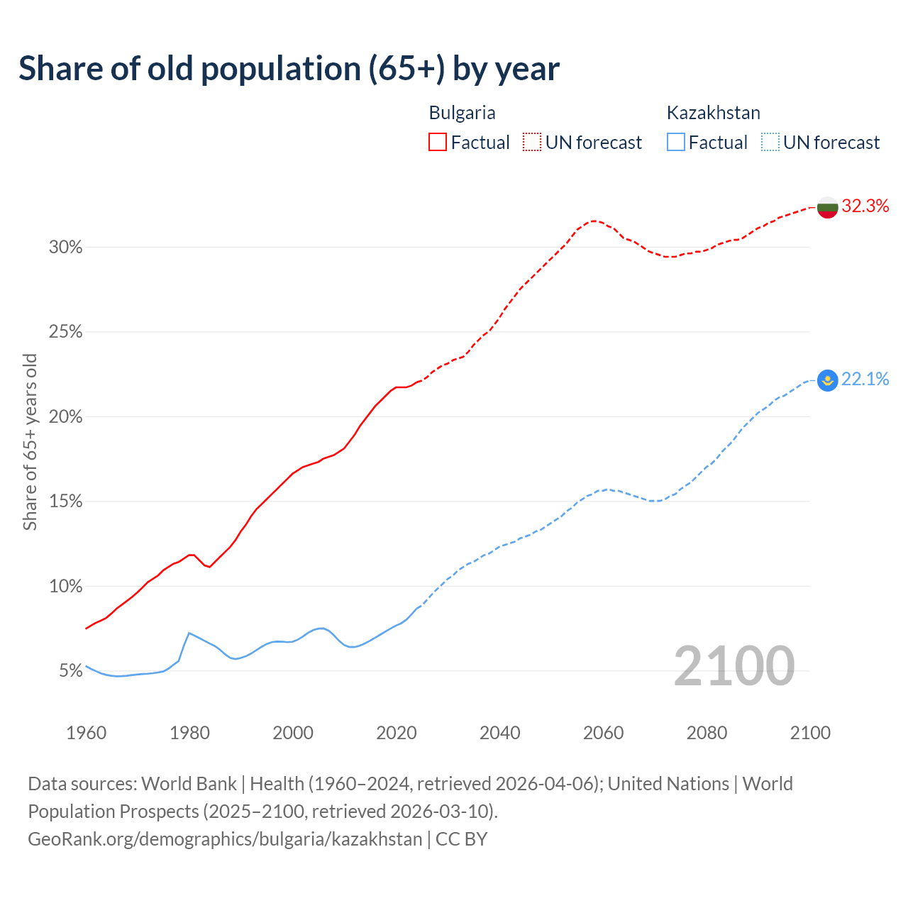 The share of older people aged 65 and over is 22% in Bulgaria and 8.65% in Kazakhstan. Life expectancy in Bulgaria compared to Kazakhstan .