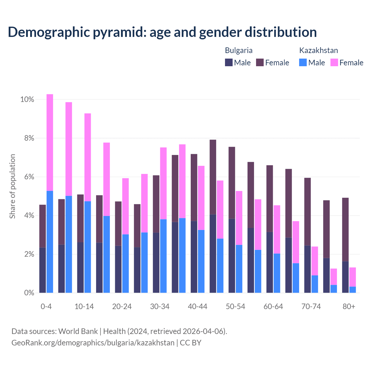 - Bulgaria is ranked 12/196 by median age (oldest to youngest) vs 99/196 for Kazakhstan.