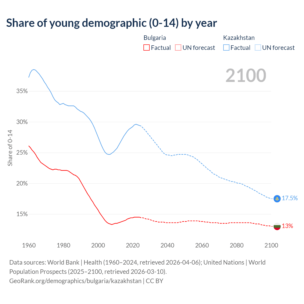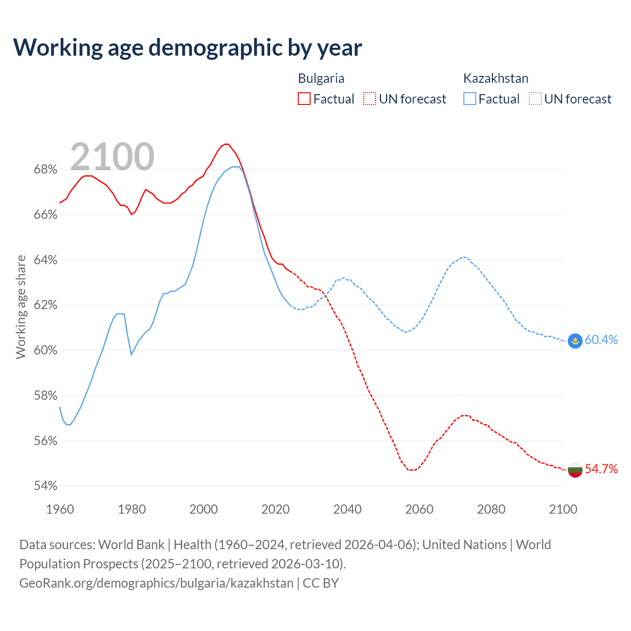 Median age Bulgaria vs Kazakhstan, 1960-2100