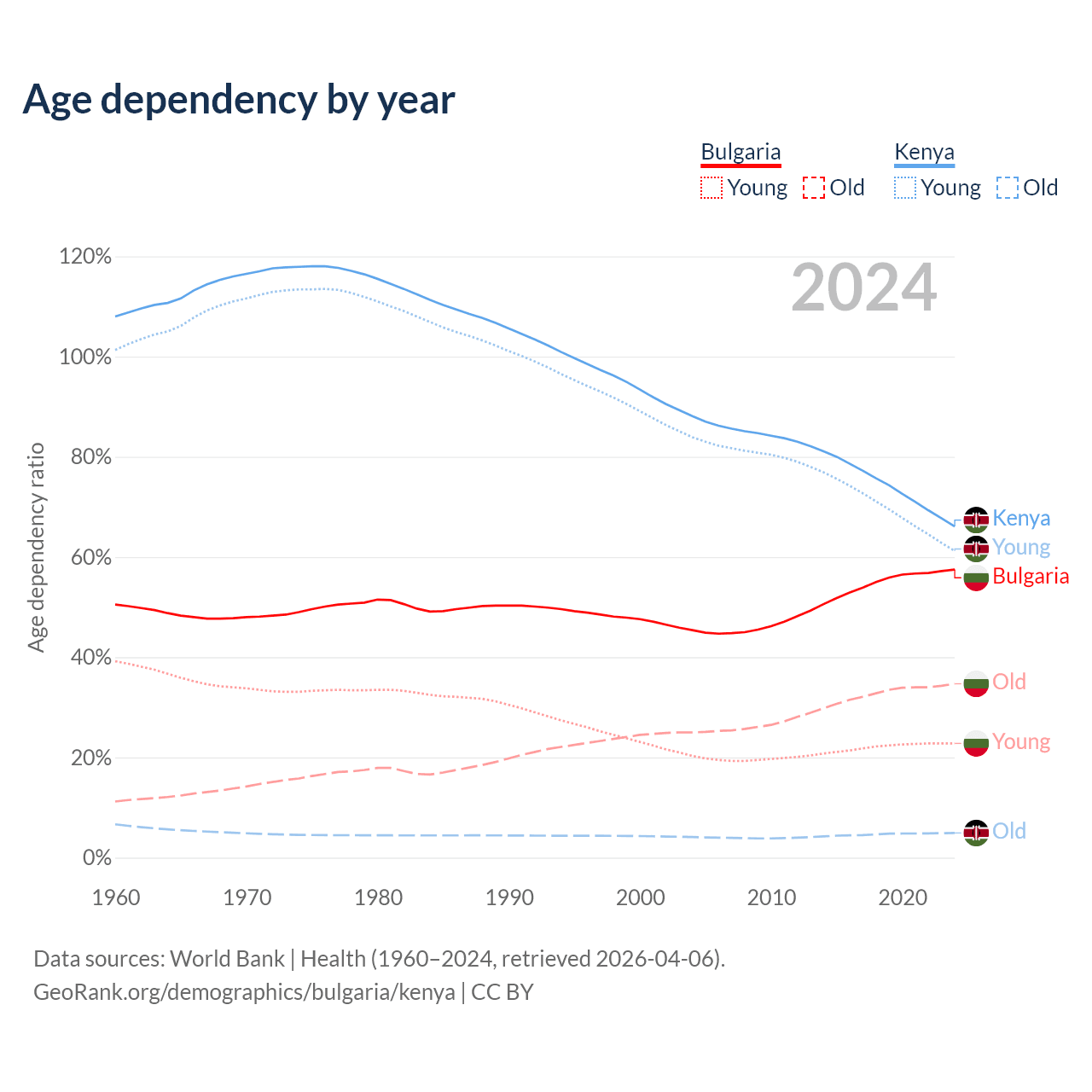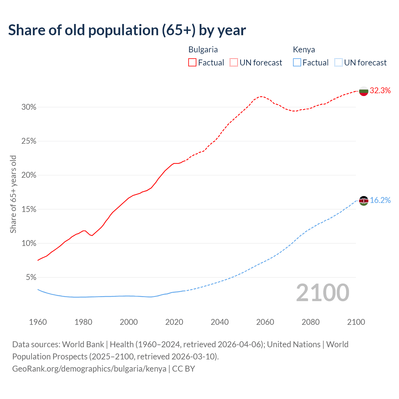 The share of older people aged 65 and over is 22% in Bulgaria and 2.97% in Kenya. Life expectancy in Bulgaria compared to Kenya .