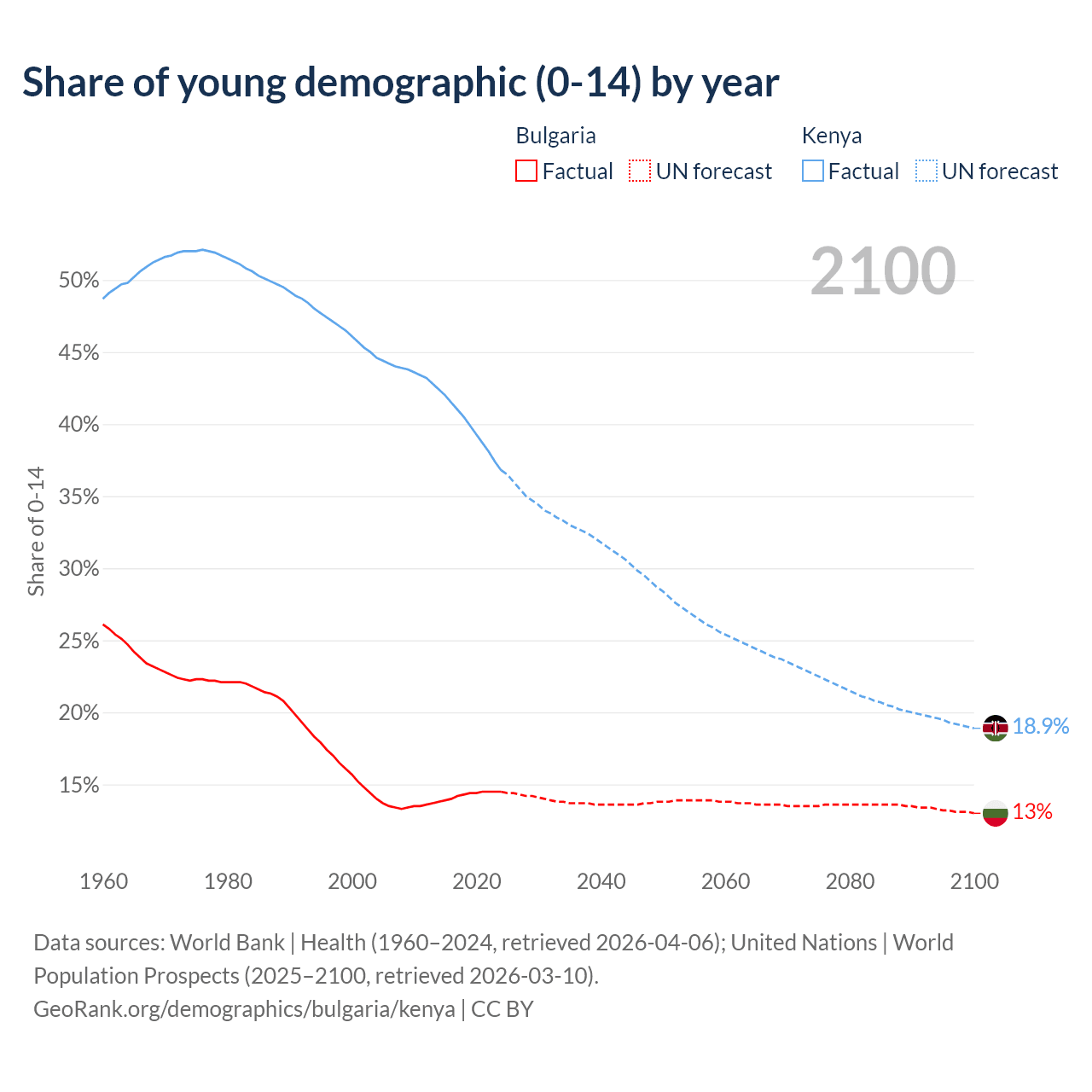 - The share of young demographic (0-15 years old) in Bulgaria is 14.5% vs 36.8% in Kenya.