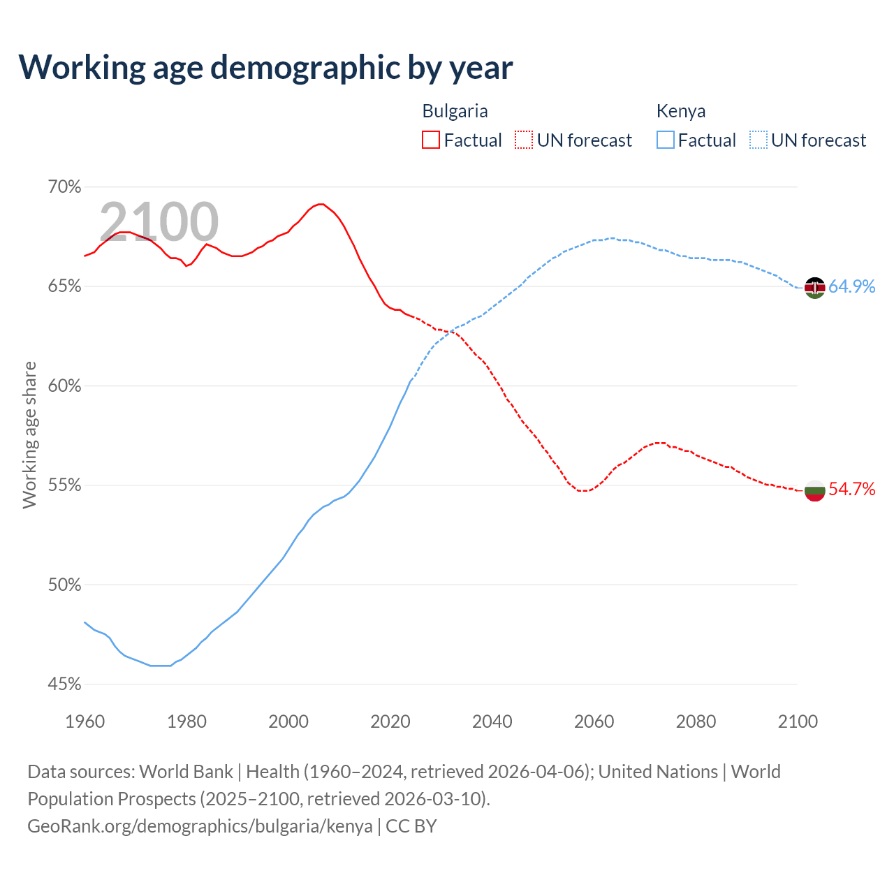 Median age Bulgaria vs Kenya, 1960-2100